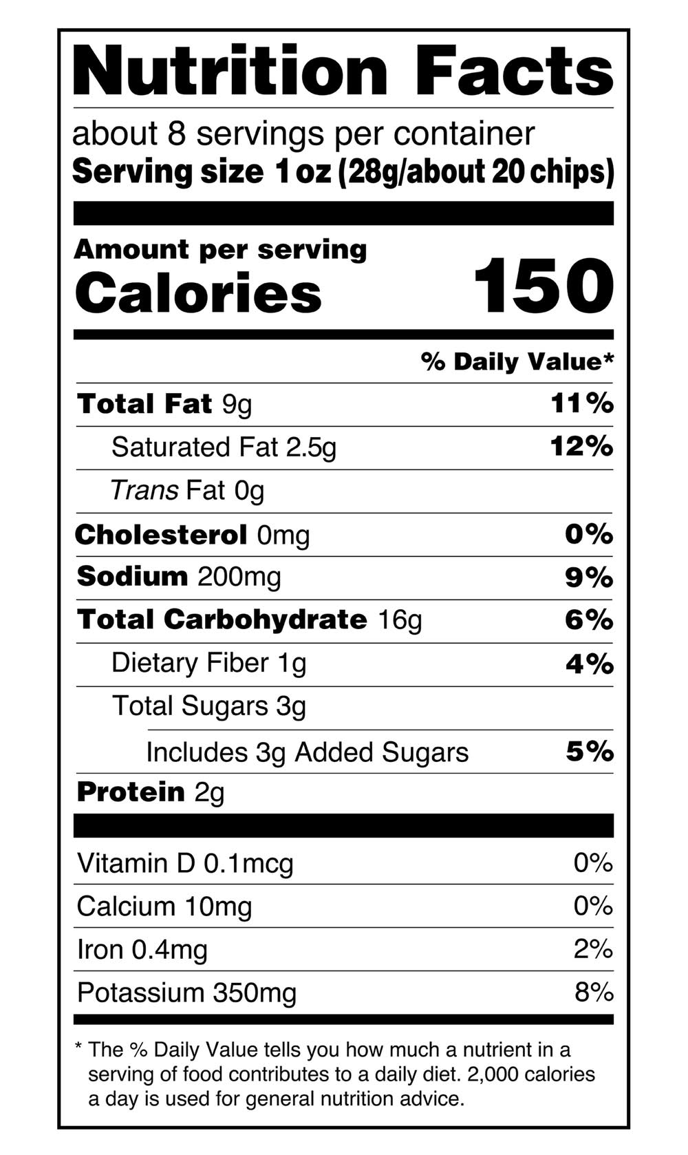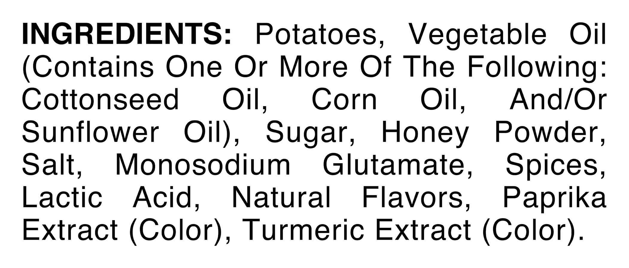 Ingredients: Potatoes, Vegetable Oil (Contains One or More of the Following: Cottonseed Oil, Corn Oil and/or Sunflower Oil), Sugar, Honey Powder, Salt, Monosodium Glutamate, Spices, Lactic Acid, Natural Flavors, Paprika Extract (Color), Turmeric Extract (Color) Contains: Corn