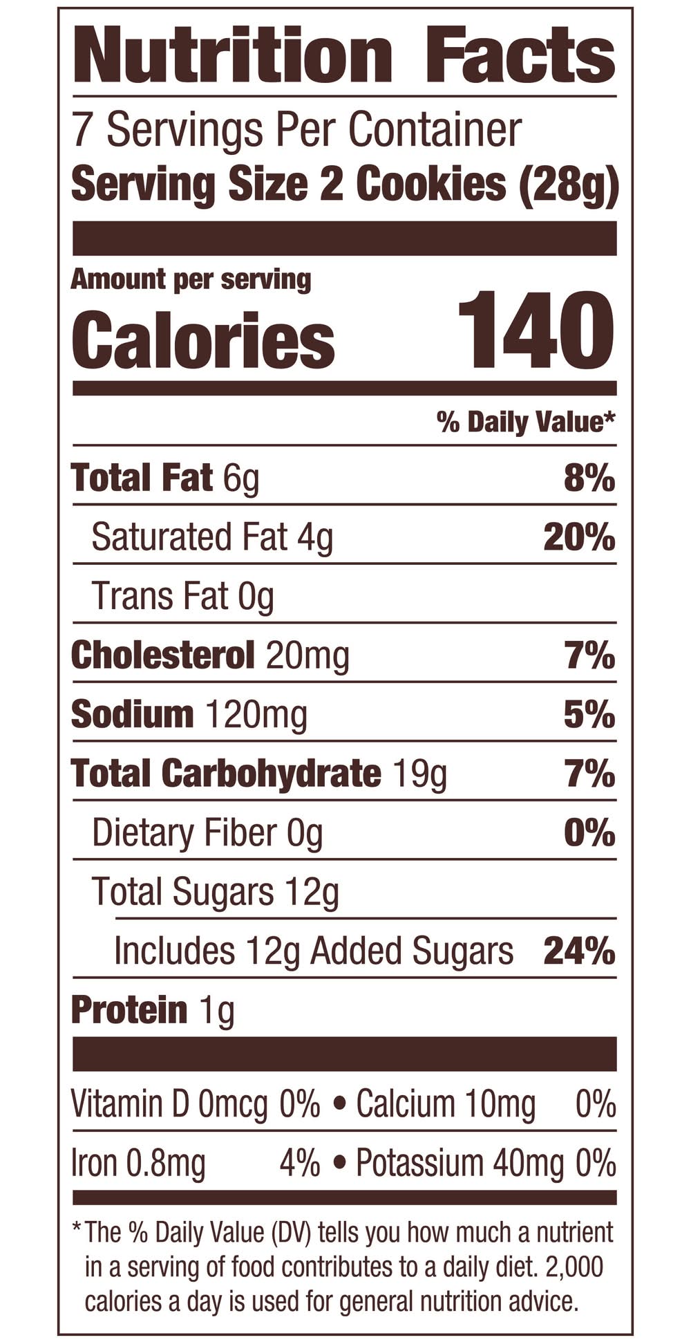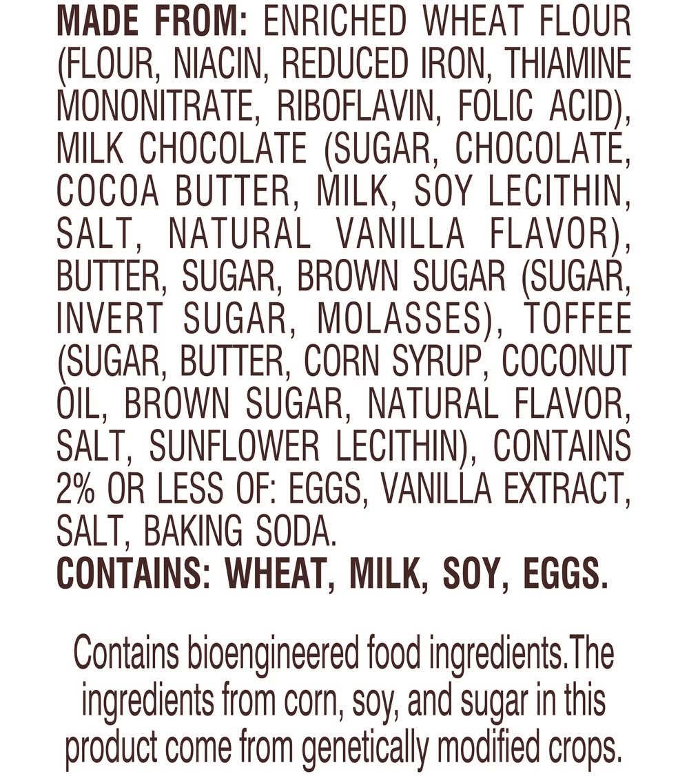 Ingredients: MADE FROM: ENRICHED WHEAT FLOUR (FLOUR, NIACIN, REDUCED IRON, THIAMINE MONONITRATE, RIBOFLAVIN, FOLIC ACID), MILK CHOCOLATE (SUGAR, CHOCOLATE, COCOA BUTTER, MILK, SOY LECITHIN, SALT, NATURAL VANILLA FLAVOR), BUTTER, SUGAR, BROWN SUGAR (SUGAR, INVERT SUGAR, MOLASSES), TOFFEE (SUGAR, BUTTER, CORN SYRUP, COCONUT OIL, BROWN SUGAR, NATURAL FLAVOR, SALT, SUNFLOWER LECITHIN), CONTAINS 2% OR LESS OF: EGGS, VANILLA EXTRACT, SALT, BAKING SODA. CONTAINS: WHEAT, MILK, SOY, EGGS. Contains: CONTAINS: Egg, Gluten, Milk/Dairy, Soybean, Wheat