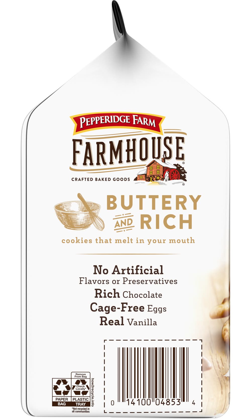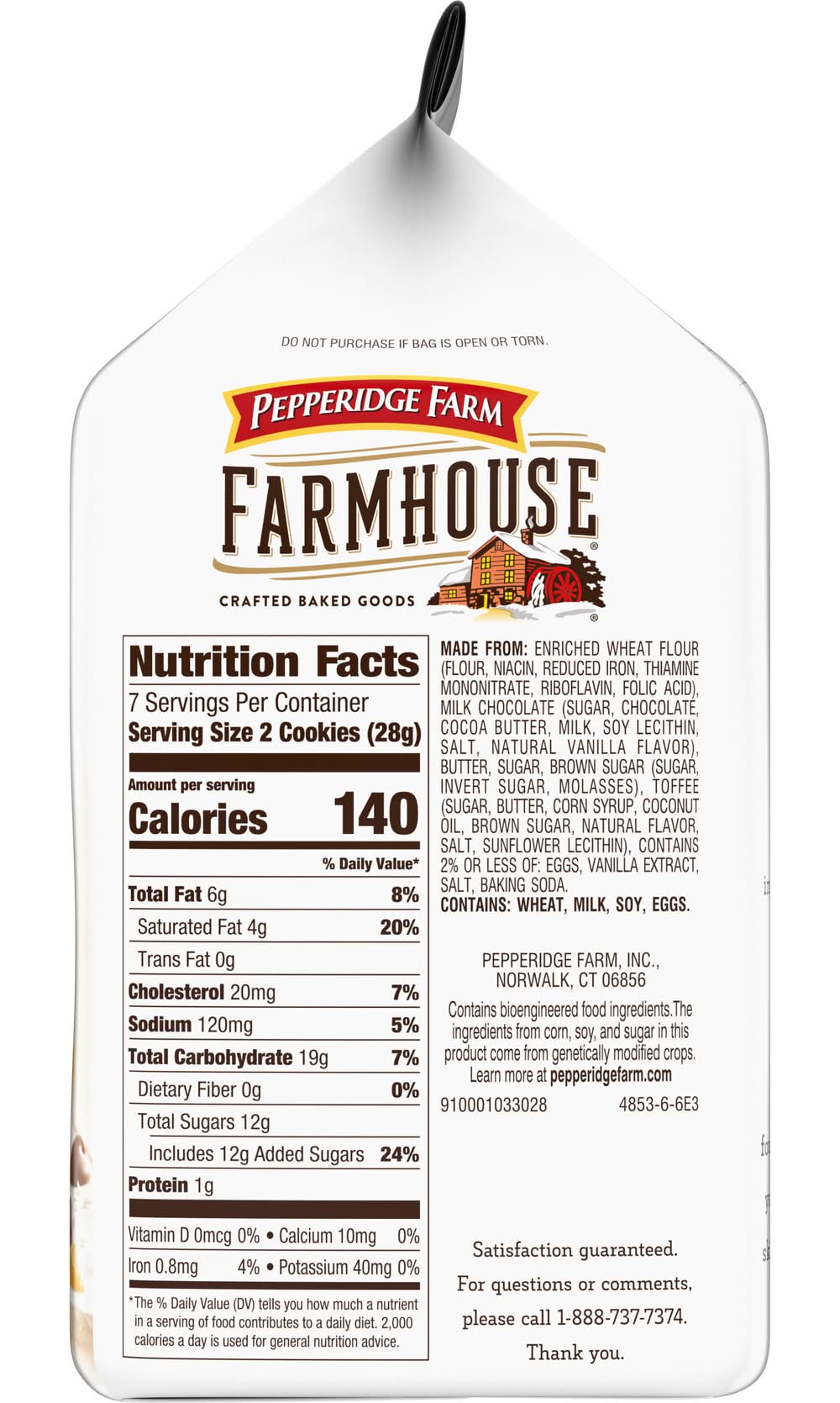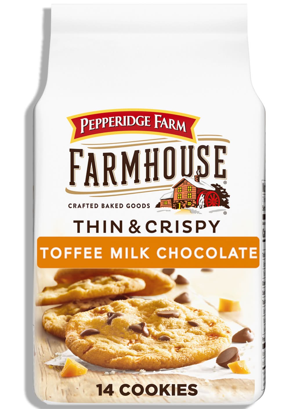 Welcome to farmhouse where our pepperidge farm bakers are working hard, thoughtfully choosing each ingredient to create mouth watering new recipes and time loved favorites.Thin and crispy toffee milk chocolate cookies are sure to delight, baked with rich chocolate and real vanilla and eggs. Since 1937, we've held true to our founder margaret rudkin's belief that when you combine the best ingredients with the skill and care of creative bakers well, the result is simply delicious. Enjoy! • Flavor: Toffee milk chocolate • Pepperidge Farm, Inc., Norwalk,NT,06856 • Packaging: Reusable