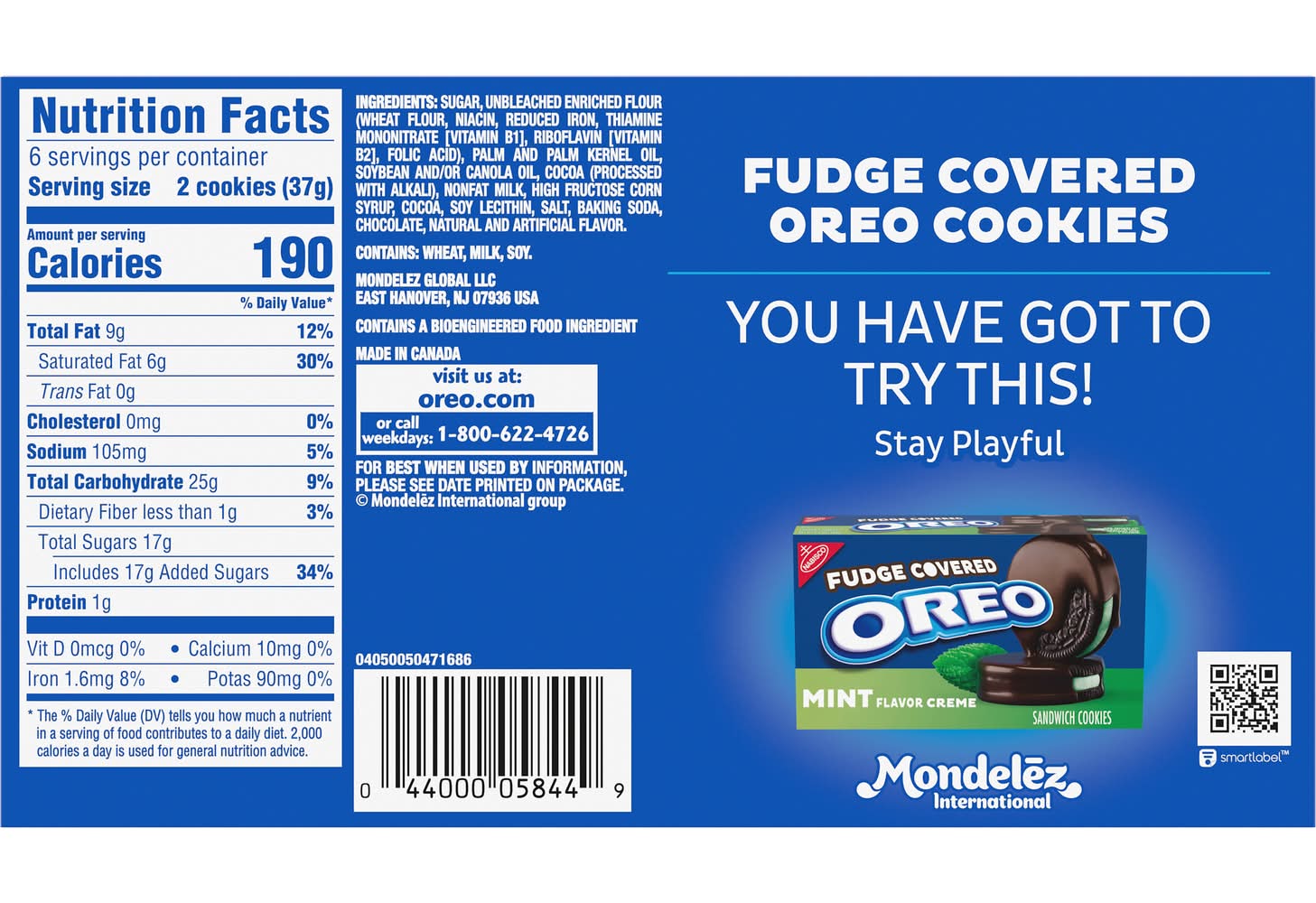 OREO Fudge Covered Chocolate Cookies bring you the classic OREO flavor with even more chocolate goodness in each bite. These chocolate covered cookies are dipped in fudge for an extra layer of sweetness. Under the extra layer of decadent fudge is the original sandwich cookie snacks that feature delicious OREO creme filling between two Always made with Real Cocoa chocolate wafers. Snack on these OREO fudge cookies at the end of a long day or enjoy them with a cold glass of cold milk. These fudge covered sandwich cookies can also make great sweet snacks for your next party. • Mondelez Global Llc, East Hanover, NJ, 07936 • Packaging: Reusable