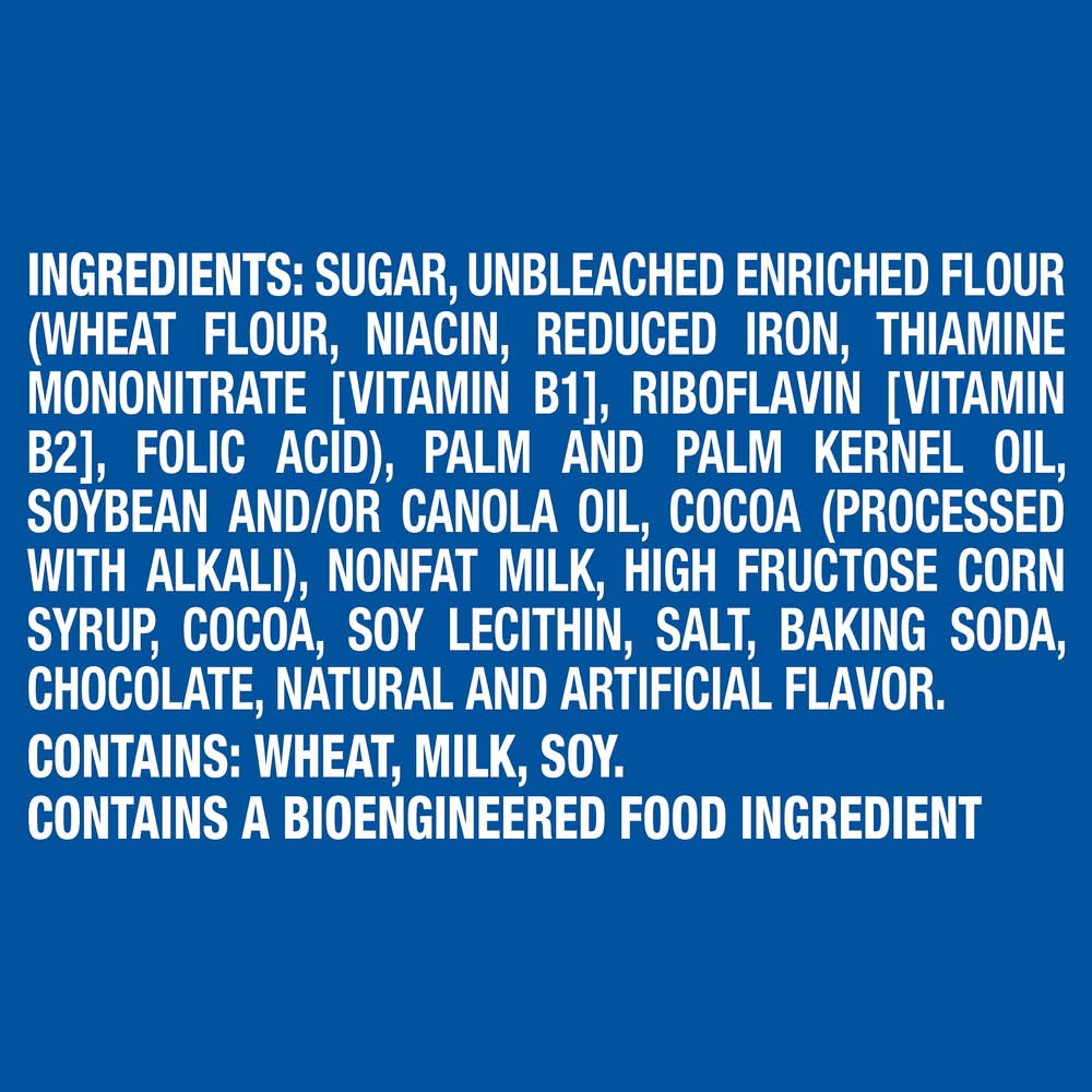 Ingredients: INGREDIENTS: SUGAR, UNBLEACHED ENRICHED FLOUR (WHEAT FLOUR, NIACIN, REDUCED IRON, THIAMINE MONONITRATE [VITAMIN B1], RIBOFLAVIN [VITAMIN B2], FOLIC ACID), PALM AND PALM KERNEL OIL, SOYBEAN AND, OR CANOLA OIL, COCOA (PROCESSED WITH ALKALI), NONFAT MILK, HIGH FRUCTOSE CORN SYRUP, COCOA, SOY LECITHIN, SALT, BAKING SODA, CHOCOLATE, NATURAL AND ARTIFICIAL FLAVOR. CONTAINS: MILK, WHEAT, SOY. Contains: Wheat, Soybeans, Milk, Corn