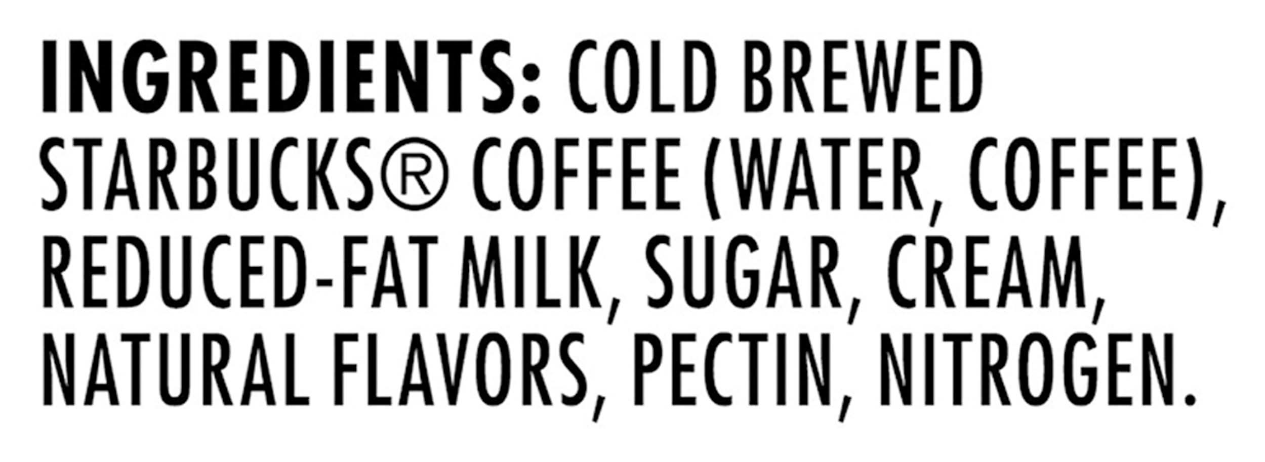 Ingredients: Cold Brewed Starbucks Coffee (Water, Coffee), Reduced-Fat Milk, Sugar, Cream, Natural Flavors, Pectin, Nitrogen Contains: Milk