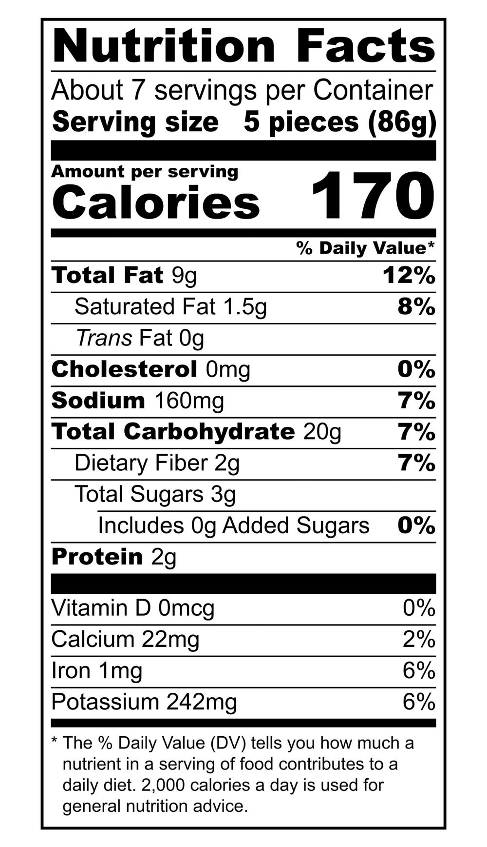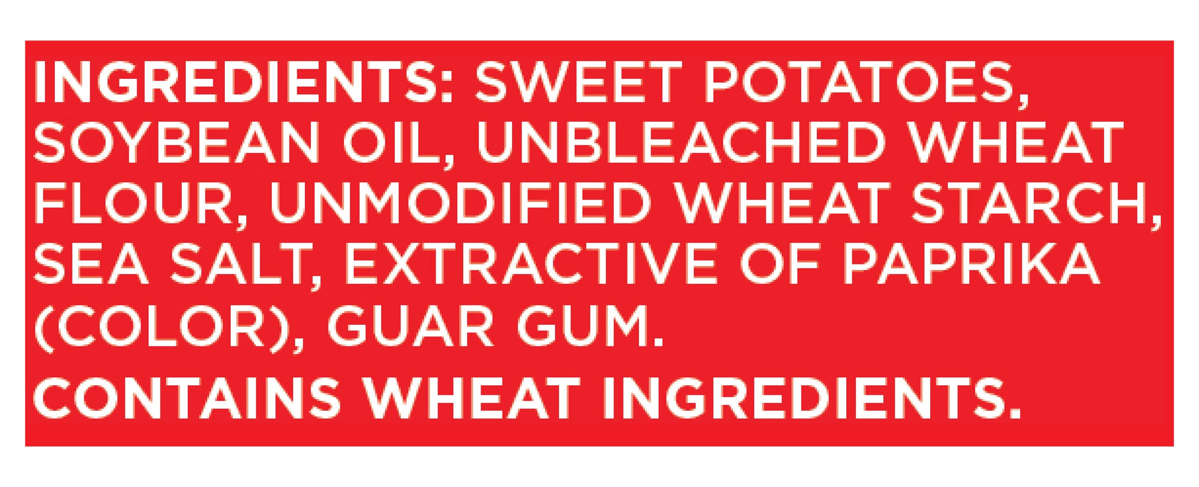 Ingredients: Sweet Potatoes, Soybean Oil, Unbleached Wheat Flour, Unmodified Wheat Starch, Sea Salt, Extractive of Paprika (Color), Guar Gum Contains: Wheat, Soybeans