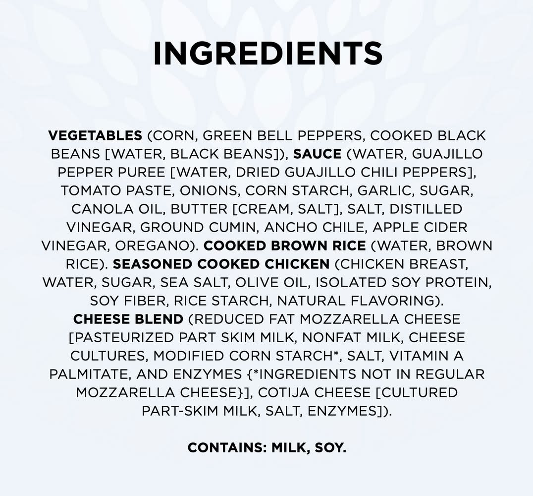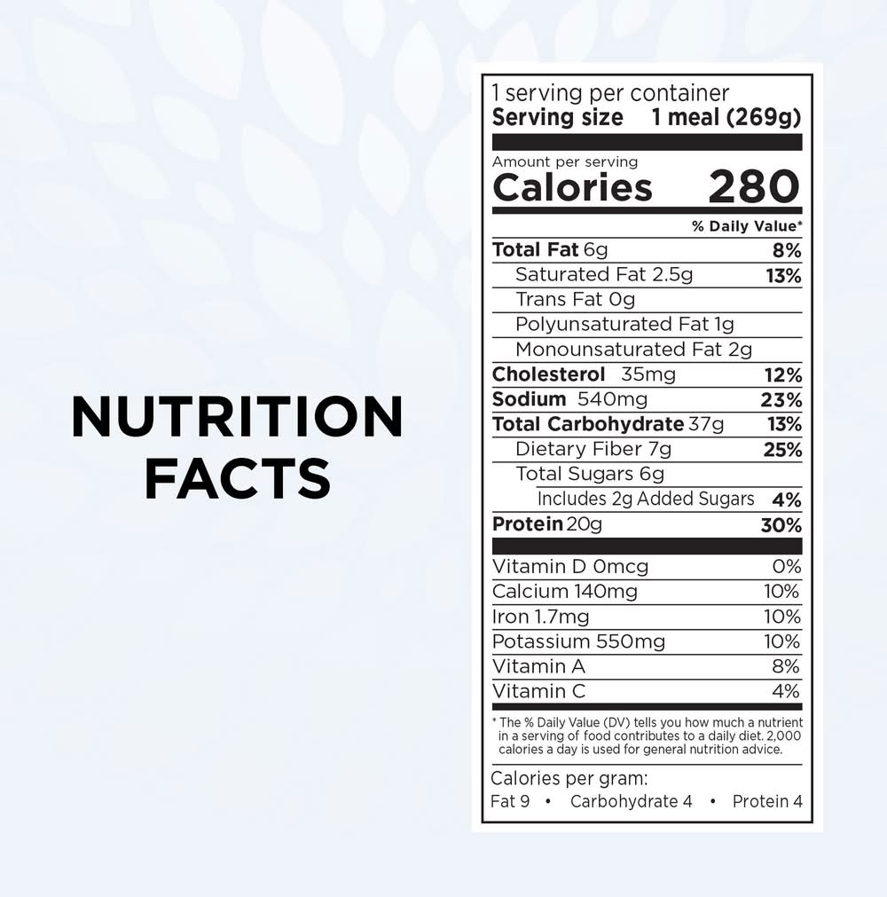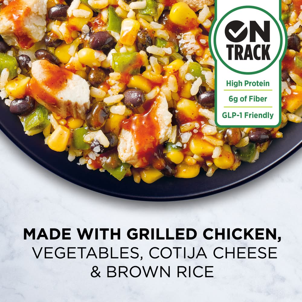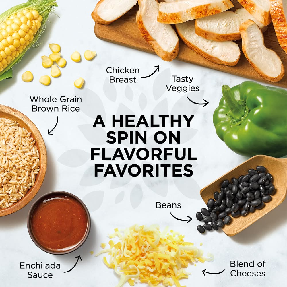 Healthy Choice Simply Steamers Southwest-Style Chicken Burrito Bowl satisfies your cravings with quality ingredients. Made with 100% natural* chicken, this microwavable meal is filled with vegetables and cotija cheese served with whole grain brown rice in an enchilada sauce. This comforting chicken burrito bowl is made with nothing artificial and is GLP-1 friendly with 20 grams of protein, 6 grams of fiber and 280 calories so you can indulge with confidence. Savor every bite of this frozen meal that is perfect for quick lunches or weeknight dinners, filling weekend meals or anytime you are craving Southwest-style chicken. Stock up on Healthy Choice Café Steamers for frozen meals that help you stay on track. * No artificial ingredients. Minimally processed.