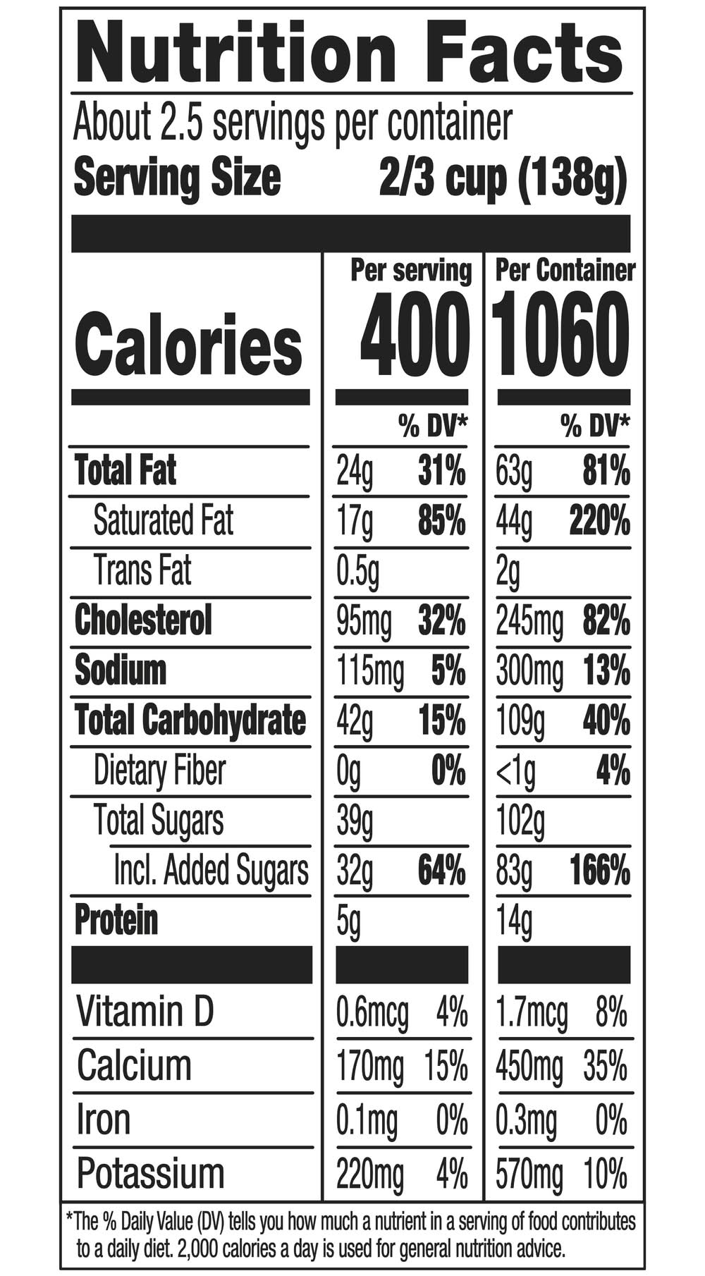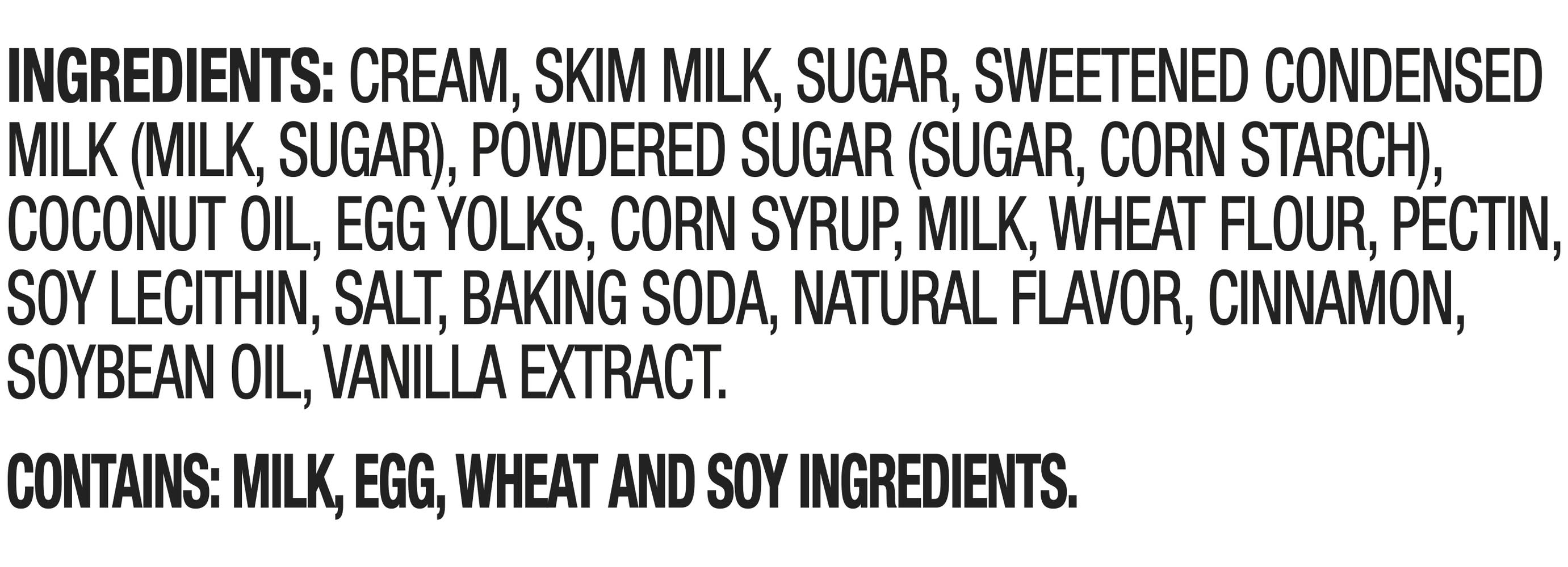 Ingredients: Cream, Skim Milk, Sugar, Sweetened Condensed Milk (Milk, Sugar), Powdered Sugar (Sugar, Corn Starch), Coconut Oil, Egg Yolks, Corn Syrup, Milk, Wheat Flour, Pectin, Soy Lecithin, Salt, Baking Soda, Natural Flavor, Cinnamon, Soybean Oil, Vanilla Extract Contains: Milk, Egg, Wheat, Soy