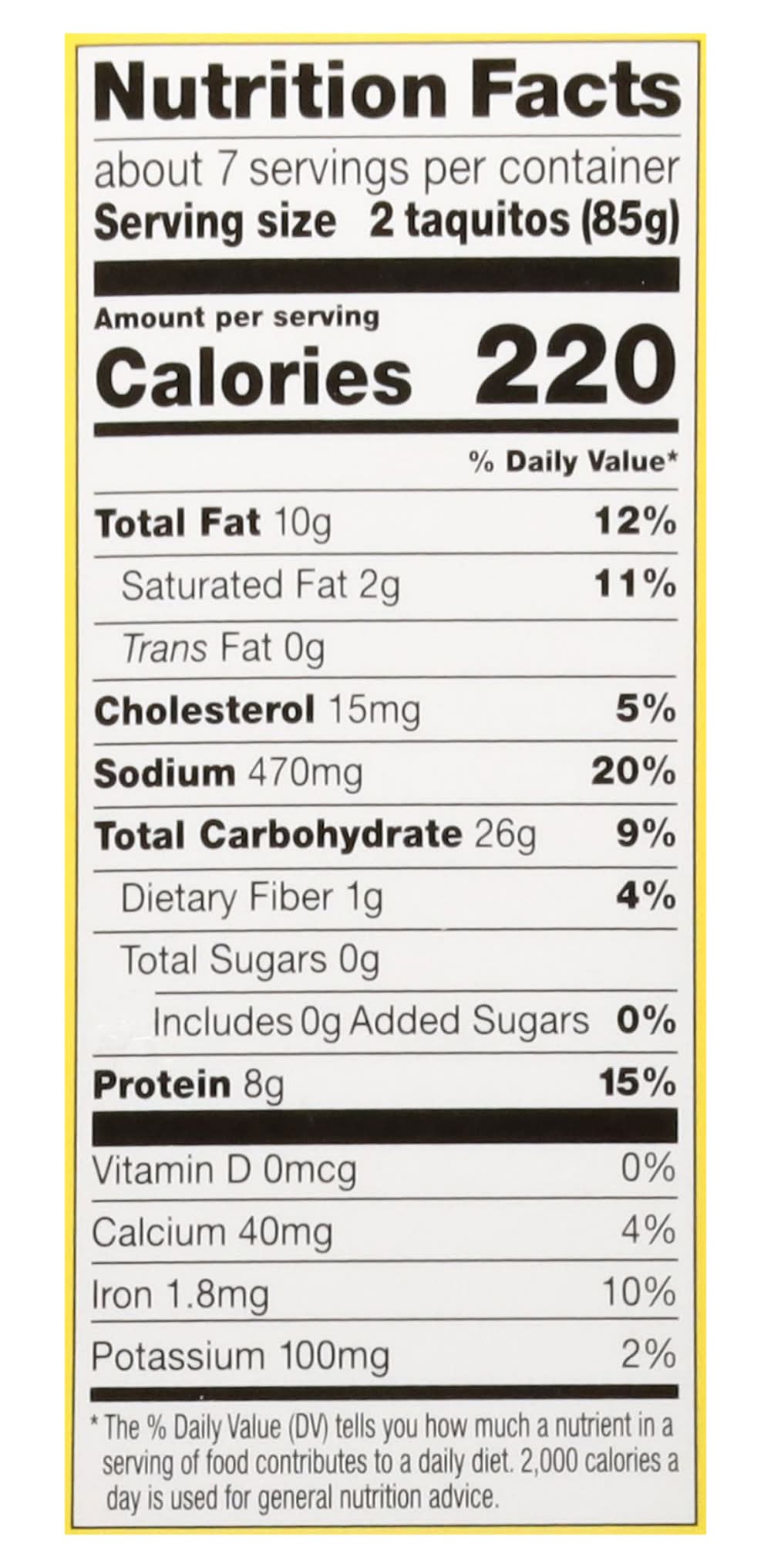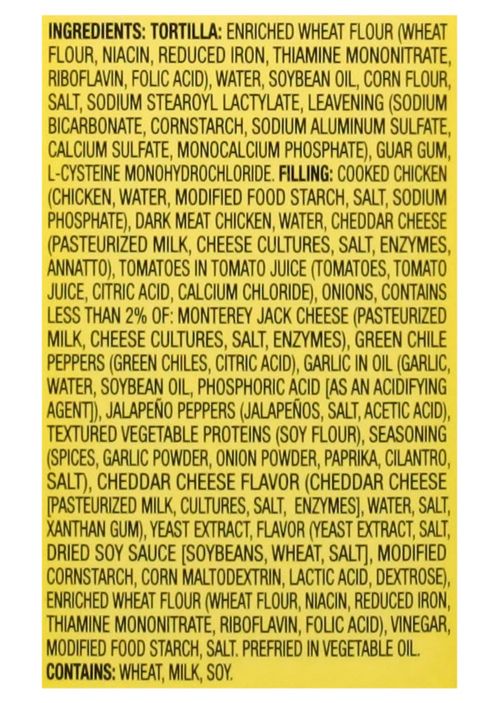 Ingredients: Tortilla: Enriched Wheat Flour (Wheat Flour, Niacin, Reduced Iron, Thiamine Mononitrate, Riboflavin, Folic Acid), Water, Soybean Oil, Corn Flour, Salt, Sodium Stearoyl Lactylate, Leavening (Sodium Bicarbonate, Cornstarch, Sodium Aluminum Sulfate, Calcium Sulfate, Monocalcium Phosphate), Guar Gum, L-Cysteine Monohydrochloride. Filling: Cooked Chicken (Chicken, Water, Modified Food Starch, Salt, Sodium Phosphate), Dark Meat Chicken, Water, Cheddar Cheese (Pasteurized Milk, Cheese Cultures, Salt, Enzymes, Annatto), Tomatoes in Tomato Juice (Tomatoes, Tomato Juice, Citric Acid, Calcium Chloride), Onions, Contains Less than 2% of: Monterey Jack Cheese (Pasteurized Milk, Cheese Cultures, Salt, Enzymes), Green Chile Peppers (Green Chiles, Citric Acid), Garlic in Oil (Garlic, Water, Soybean Oil, Phosphoric Acid [as an Acidifying Agenti]), Jalapeno Peppers (Jalapenos, Salt, Acetic Acid), Textured Vegetable Proteins (Soy Flour), Seasoning (Spices, Garlic Powder, Onion Powder, Paprika, Cilantro, Salt), Cheddar Cheese Flavor (Cheddar Cheese [Pasteurized Milk, Cultures, Salt, Enzymes), Water, Salt, Xanthan Gum), Yeast Extract, Flavor (Yeast Extract, Salt, Dried Soy Sauce [Soybeans, Wheat, Salt], Modified Cornstarch, Corn Maltodextrin, Lactic Acid, Dextrose), Enriched Wheat Flour (Wheat Flour, Niacin, Reduced Iron, Thiamine Mononitrate, Riboflavin, Folic Acid), Vinegar, Modified Food Starch, Salt, Prefried in Vegetable Oil Contains: Wheat, Milk, Soybeans