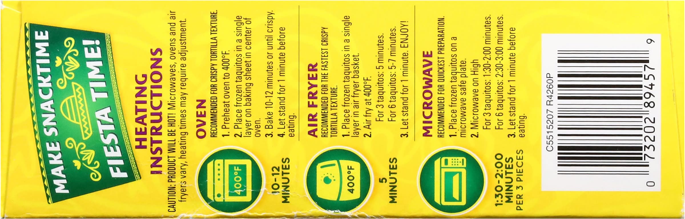 Directions for use: Heating Instruction: Oven: Recommended for best results. Preheat oven to 400 degrees F. Place frozen taquitos on baking sheet in center of the oven. Bake 10-12 minutes or until crispy. Let stand 1 minute. Microwave: Place 3 frozen taquitos on a plate. Microwave on high 1:30-2:00 minutes. When preparing 6 frozen taquitos, increase heating time to 2:30 - 3:00 minutes. Let stand 1 minute. Caution: Product will be hot! Microwaves and ovens vary, heating times may require adjustment. Keep frozen. Storage recommendation: Keep frozen.