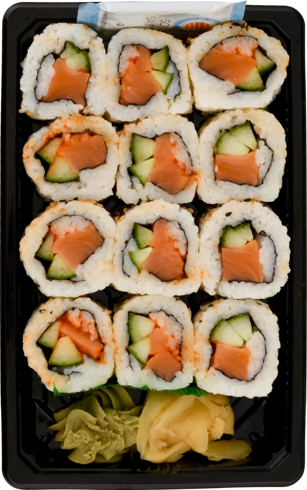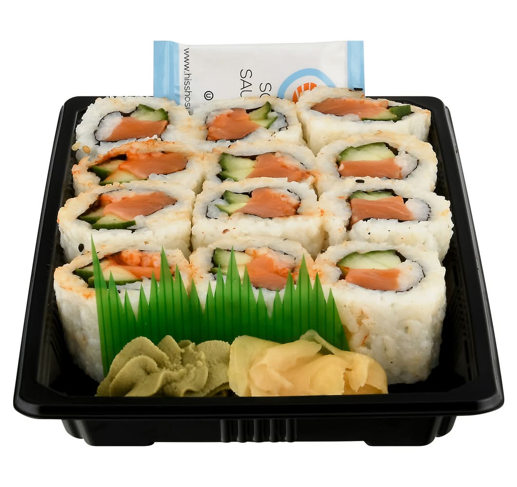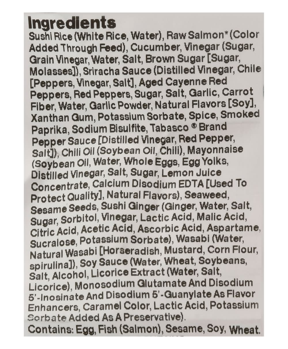 Ingredients: Soy Sauce: Water, Wheat, Soybeans, Salt, Alcohol. Sushi Rice (White Rice, Water), Raw Salmon (This product contains raw fish). (Color Added Through Feed), Cucumber, Vinegar (Sugar, Grain Vinegar, Water, Salt, Brow Sugar [Sugar, Molasses]), Sriracha Sauce (Distilled Vinegar, Chile [Peppers, Vinegar, Salt], Aged Cayenne Red Peppers, Red Peppers, Sugar, Salt, Garlic, Carrot Fiber, Water, Garlic Powder, Natural Flavors [Soy], Xanthan Gum, Potassium Sorbate, Spice, Smoked Paprika, Sodium Bisulfite, Tabasco Brand Pepper Sauce [Distilled Vinegar, Red Pepper, Salt]), Chili Oil (Soybean Oil, Chili), Mayonnaise (Soybean Oil, Water, Whole Eggs, Egg Yolks, Distilled Vinegar, Salt, Sugar, Lemon Juice Concentrate, Calcium Disodium EDTA [Used to Protect Quality], Natural Flavors), Seaweed, Sesame Seeds, Sushi Ginger (Ginger, Water, Salt, Sugar, Sorbitol, Vinegar, Lactic Acid, Malic Acid, Citric Acid, Acetic Acid, Ascorbic Acid, Aspartame, Sucralose, Potassium Sorbate), Wasabi (Water, Natural Wasabi [Horseradish, Mustard, Corn Flour, Spirulina]), Soy Sauce (Water, Wheat, Soybeans, Salt, Alcohol, Licorice Extract (Water, Salt, Licorice), Monosodium Glutamate and Disodium 5-Inosinate and Disodium 5'-Guanylate as Flavor Enhancers, Caramel Color, Lactic Acid, Potassium Sorbate Added as a Preservative) Contains: Eggs, Fish, Fish, Salmon, Sesame, Soybeans, Wheat, Mustard, Corn, Sulfites