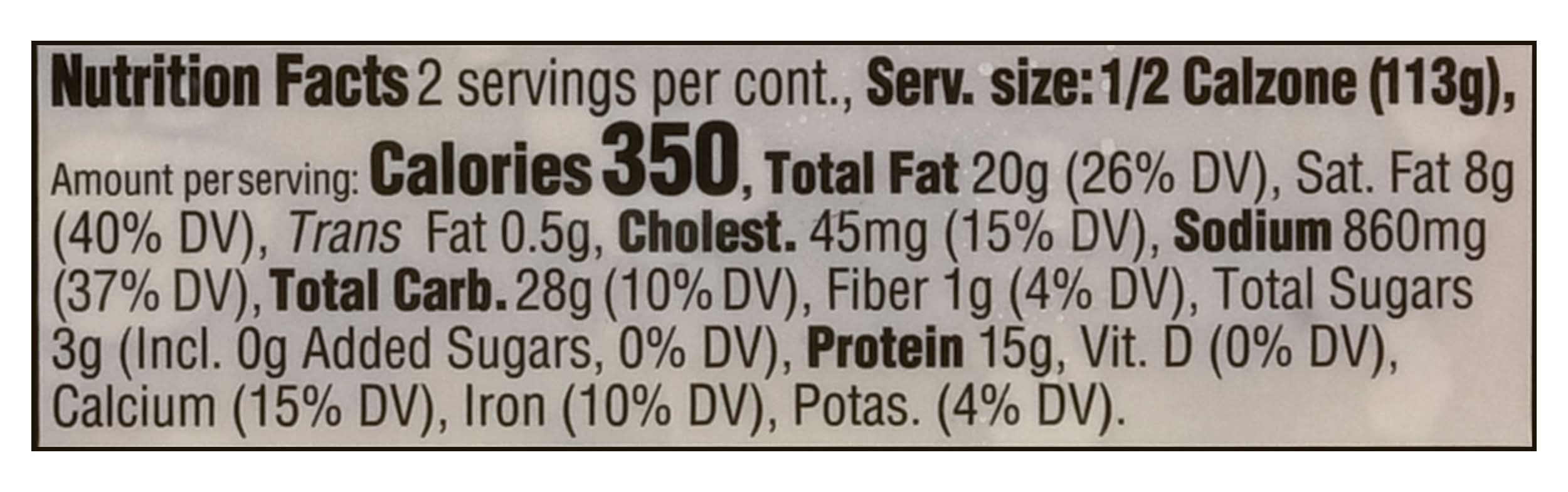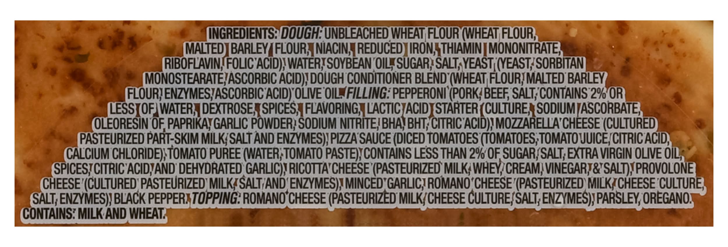 Ingredients: Dough: Unbleached Wheat Flour (Wheat Flour, Malted Barley Flour, Niacin, Reduced Iron, Thiamine Mononitrate, Riboflavin, Folic Acid)! Water, Soybean Oil, Sugar, Salt, Yeast (Yeast, Sorbitan Monostearate, Ascorbic Acid), Dough Conditioner Blend (Wheat Flour), Malted Barley Flour, Enzymes, Ascorbic Acid) Olive Oil Filling: Pepperoni (Pork Beef, Salt Contains 2% or Less of Water, Dextrose, Spices, Flavoring, Lactic Acid Starter (Culture, Sodium Ascorbate, Oleoresin of Paprika Garlic Powder, Sodium Nitrite, BHA BHT, Citric Acid) Mozzarella Cheese (Cultured Pasteurized Part-Skim Milk/Salt and Enzymes); Pizza Sauce (Diced Tomatoes (Tomatoes, Tomato Juice Citric Acid, Calcium Chloride); Tomato Puree (Water, Tomato Paste) Contains Less than 2% of Sugar, Salt, Extra Virgin Olive Oil, Spices Citric Acid and Dehydrated Garlic) Ricotta Cheese (Pasteurized Milk Whey Cream, Vinegar & Salt) Provolone Cheese (Cultured Pasteurized Milk Salt and Enzymes) Minced Garlic Romano Cheese (Pasteurized Milk Cheese Culture, Salt, Enzymes); Black Pepper Topping: Romano Cheese (Pasteurized Milk/Cheese Culture/Salt, Enzymes), Parsley, Oregano Contains: Milk, Wheat, Barley, Soybeans