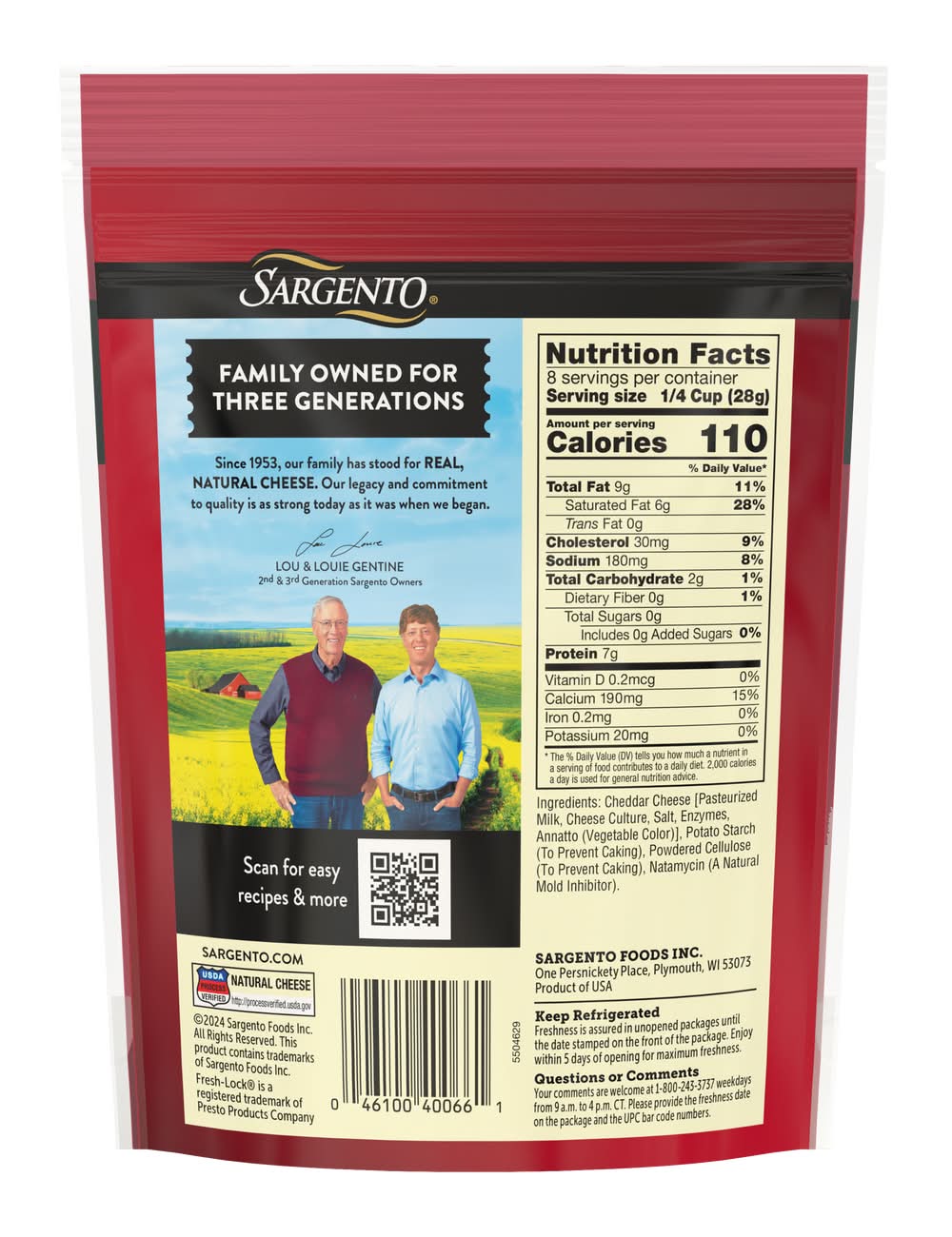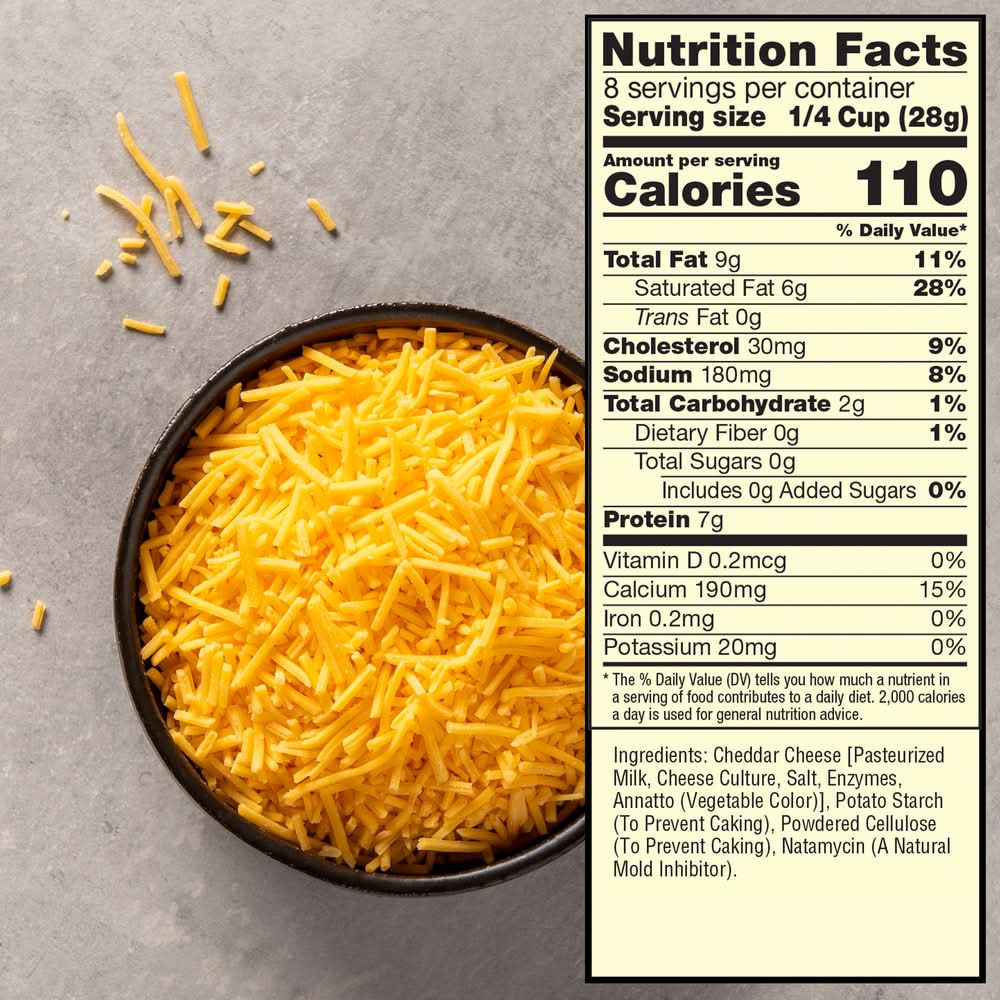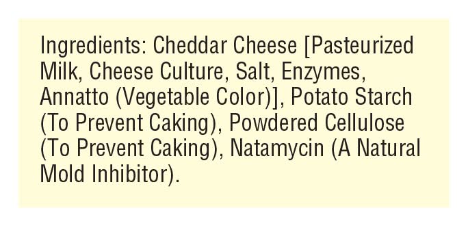Ingredients: Cheddar Cheese [Pasteurized Milk, Cheese Culture, Salt, Enzymes, Annatto (Vegetable Color)], Potato Starch (to Prevent Caking), Powdered Cellulose (to Prevent Caking), Natamycin (a Natural Mold Inhibitor) Contains: Milk