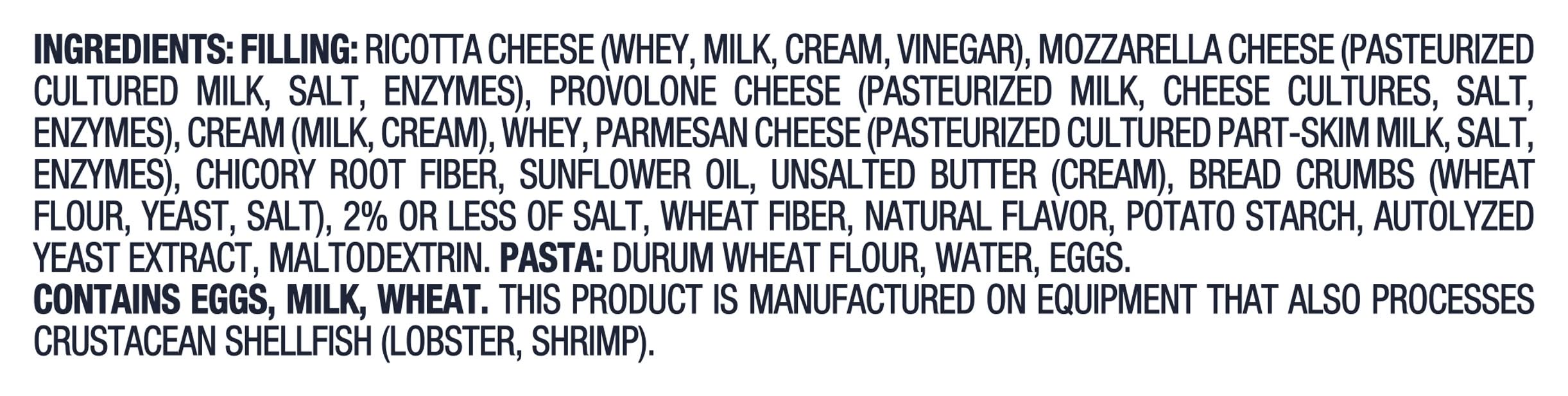 Ingredients: Filling: Ricotta Cheese (Whey, Milk, Cream, Vinegar), Mozzarella Cheese (Pasteurized Cultured Milk, Salt, Enzymes), Provolone Cheese (Pasteurized Milk, Cheese Cultures, Salt, Enzymes), Cream (Milk, Cream), Whey, Parmesan Cheese (Pasteurized Cultured Part-Skim Milk, Salt, Enzymes), Chicory Root Fiber, Sunflower Oil, Unsalted Butter (Cream), Bread Crumbs (Wheat Flour, Yeast, Salt), 2% or Less of Salt, Wheat Fiber, Natural Flavor, Potato Starch, Autolyzed Yeast Extract, Maltodextrin, Pasta: Durum Wheat Flour, Water, Eggs Contains: Eggs, Milk, Wheat, Crustacean Shellfish, Lobster, Crustacean Shellfish, Shrimp
