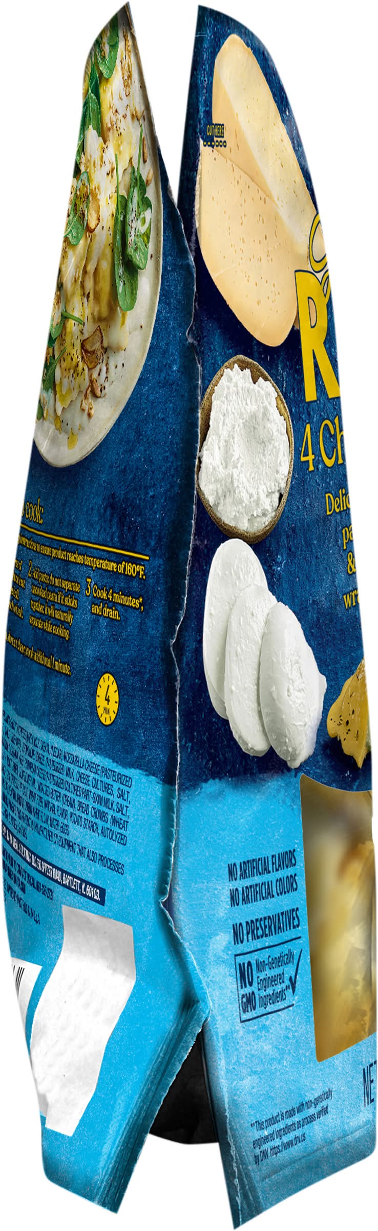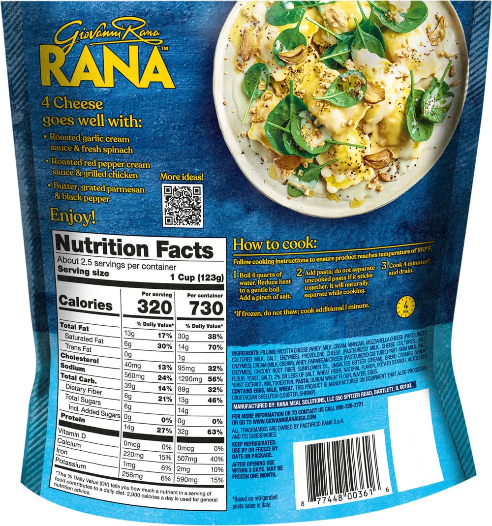 Directions for use: Preparation: Follow cooking instructions to ensure product reaches temperature of 160 degrees F. 1. Heat 6 quarts of water to a gentle boil. Add a pinch of salt. 2. Add pasta; do not separate uncooked pasta if it sticks together. It will naturally separate while cooking. Cook 4 minutes, and drain. Add 1 minute for a softer bite. 3. Enjoy the wonderful flavors of my fillings as we do in Italy: Toss in melted butter or extra virgin olive oil and top with freshly grated cheese. If frozen, do not thaw; cook additional 1 minute. Serving Suggestions: Pair with Giovanni Rana Portobello Mushroom Sauce or try. 4 cheese ravioli puttanesca. Saute olive, capers and anchovies in olive oil. Add fresh tomato sauce. Add prepared ravioli and a drizzle of olive oil on top. Keep refrigerated. Use or freeze by date on front of package. May be frozen one month. Storage recommendation: Keep refrigerated. Use or freeze by date on front of package. May be frozen one month