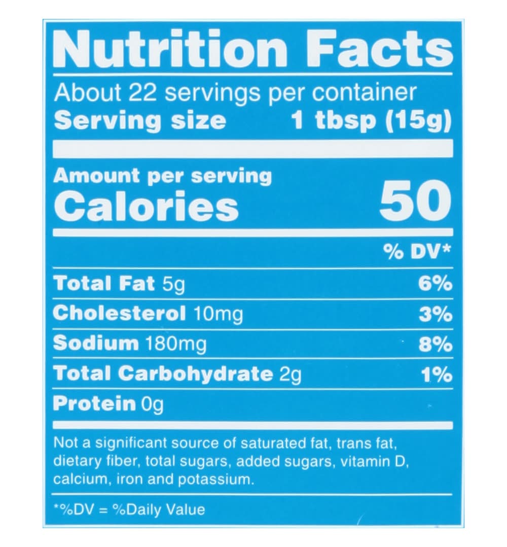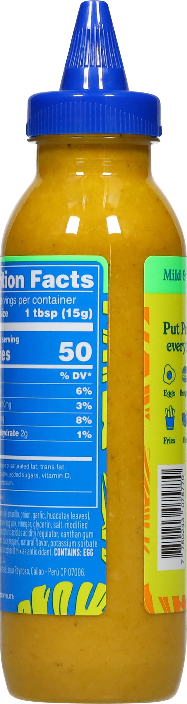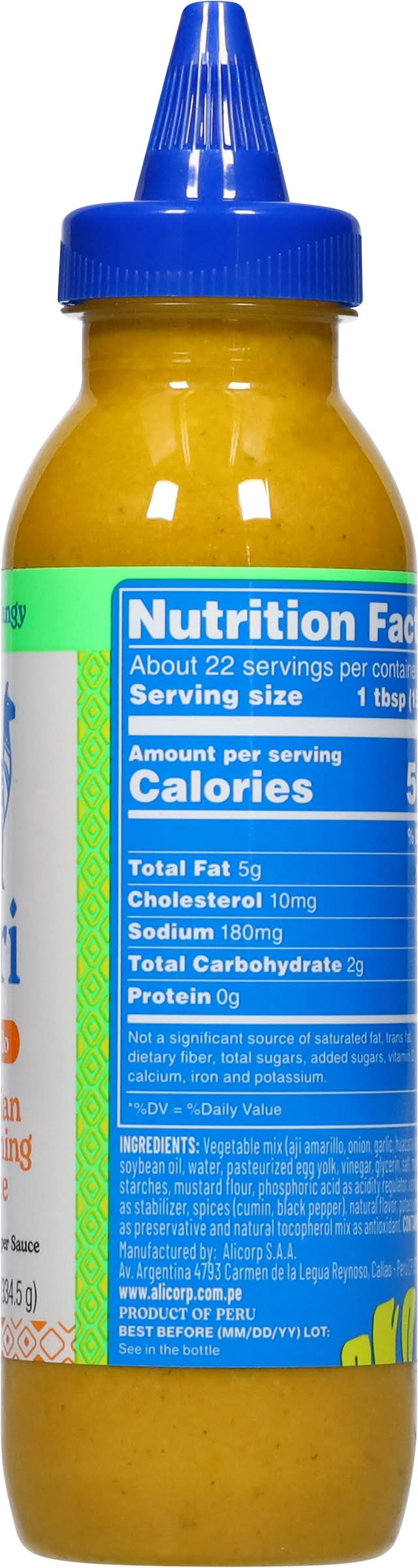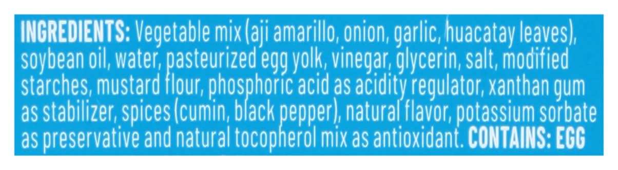 Ingredients: Vegetable Mix (Aji Amarillo, Onion, Garlic, Huacatay Leaves), Soybean Oil, Water, Pasteurized Egg Yolk, Vinegar, Glycerin, Salt, Modified Starches, Mustard Flour, Phosphoric Acid as Acidity Regulator, Xanthan Gum as Stabilizer, Spices (Cumin, Black Pepper), Natural Flavor, Potassium Sorbate as Preservative and Natural Tocopherol Mix as Antioxidant Contains: Eggs, Soybeans, Mustard