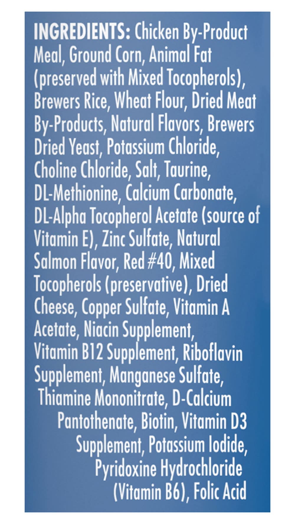Ingredients: Chicken By-Product Meal, Ground Corn, Animal Fat (Preserved with Mixed Tocopherols), Brewers Rice, Wheat Flour, Dried Meat By-Products, Natural Flavors, Brewers Dried Yeast, Potassium Chloride, Choline Chloride, Salt, Taurine, DL-Methionine, Calcium Carbonate, DL-Alpha Tocopherol Acetate (Source O Vitamin E), Zinc Sulfate, Natural Salmon Flavor, Red 40, Mixed Tocopherols (Preservative), Dried Cheese, Copper Sulfate, Vitamin A Acetate, Niacin Supplement, Vitamin B12 Supplement, Riboflavin Supplement, Manganese Sulfate, Thiamine Mononitrate, D-Calcium Pantothenate, Biotin, Vitamin D3 Supplement, Potassium Iodide, Pyridoxine Hydrochloride (Vitamin B6), Folic Acid Contains: Wheat, Fish