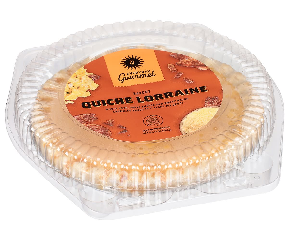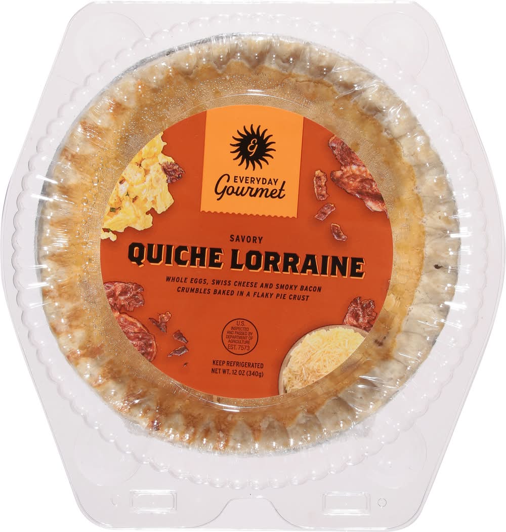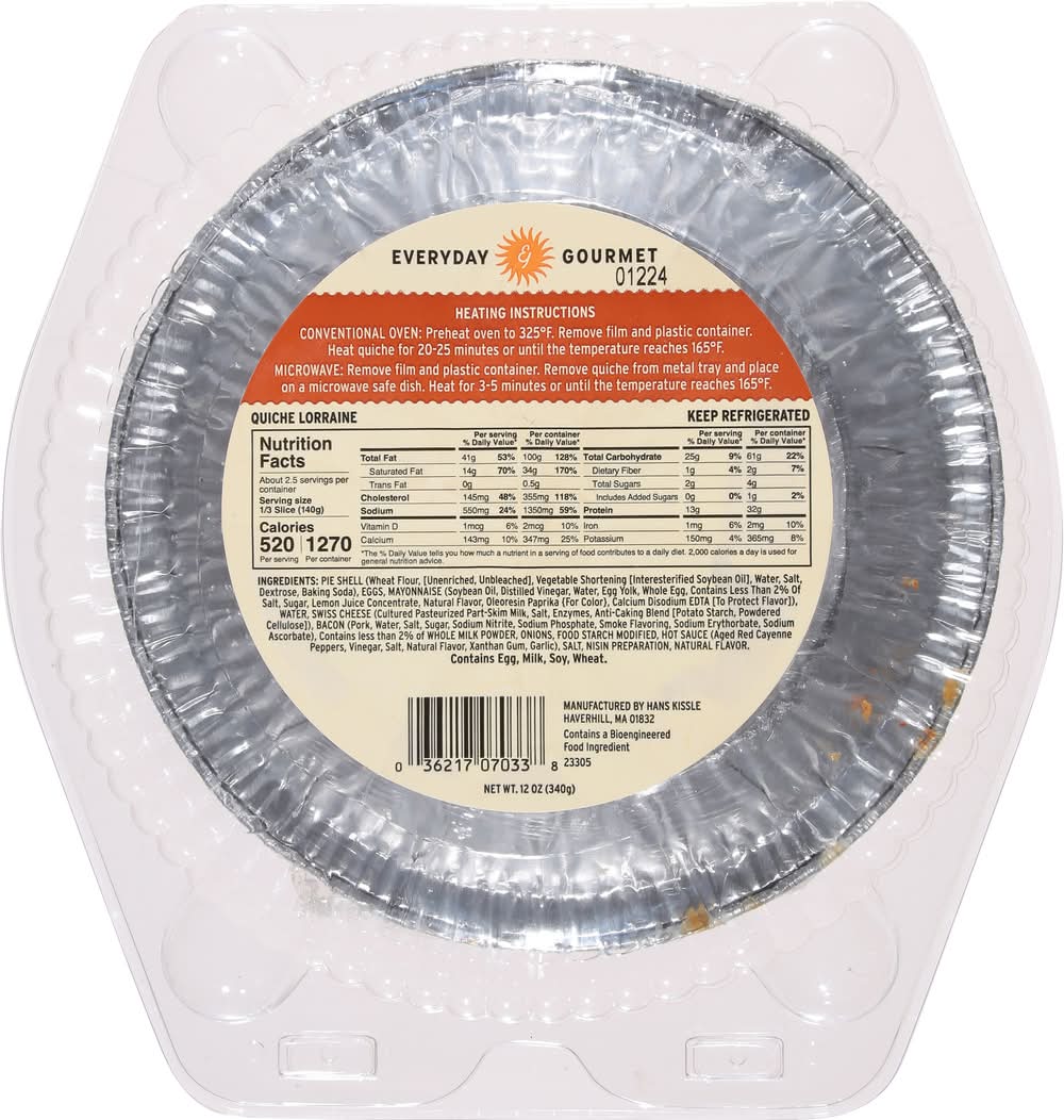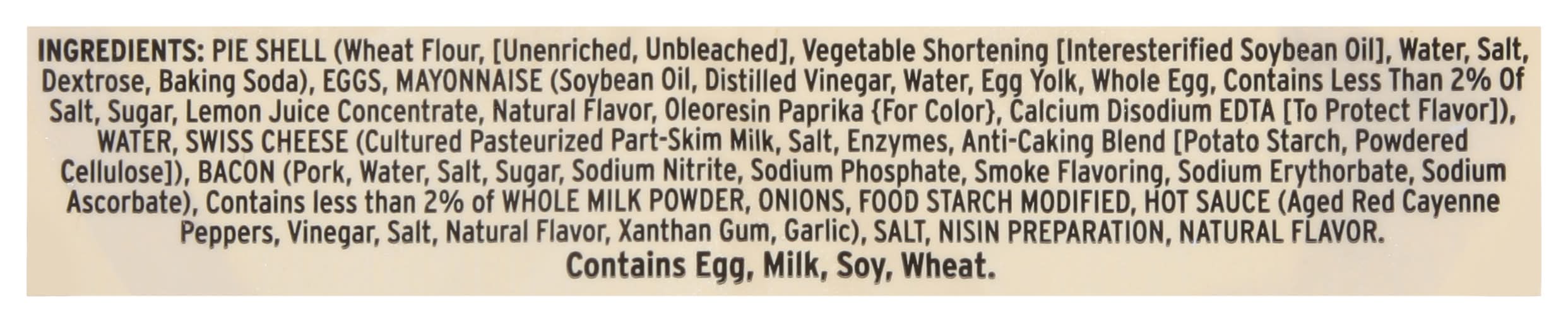 Ingredients: Pie Shell (Wheat Flour, [Unenriched, Unbleached], Vegetable Shortening [Interesterified Soybean Oil], Water, Salt, Dextrose, Baking Soda), Eggs, Mayonnaise (Soybean Oil, Distilled Vinegar, Water, Egg Yolk, Whole Egg, Contains Less than 2% of Salt, Sugar, Lemon Juice Concentrate, Natural Flavor, Oleoresin Paprika (for Color), Calcium Disodium EDTA [to Protect Flavor]), Water, Swiss Cheese (Cultured Pasteurized Part-Skim Milk, Salt, Enzymes, Anti-Caking Blend [Potato Starch, Powdered Cellulose]), Bacon (Pork, Water, Salt, Sugar, Sodium Nitrite, Sodium Phosphate, Smoke Flavoring, Sodium Erythorbate, Sodium Ascorbate), Contains Less than 2% of Whole Milk Powder, Onions, Food Starch Modified, Hot Sauce (Aged Red Cayenne Peppers, Vinegar, Salt, Natural Flavor, Xanthan Gum, Garlic), Salt, Nisin Preparation, Natural Flavor Contains: Eggs, Milk, Soybeans, Wheat