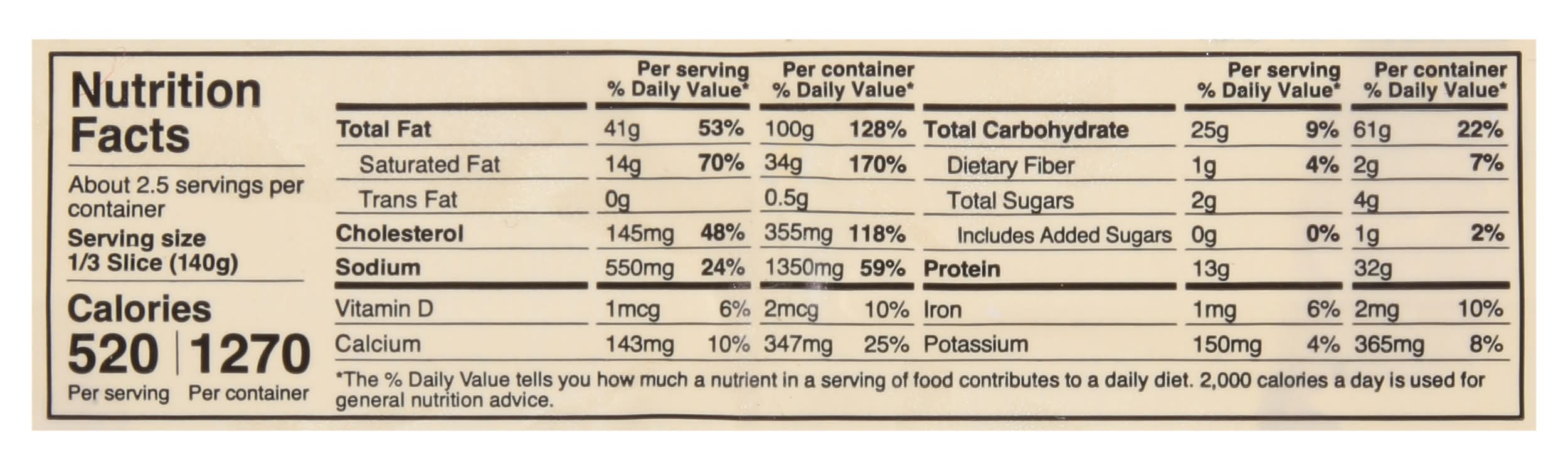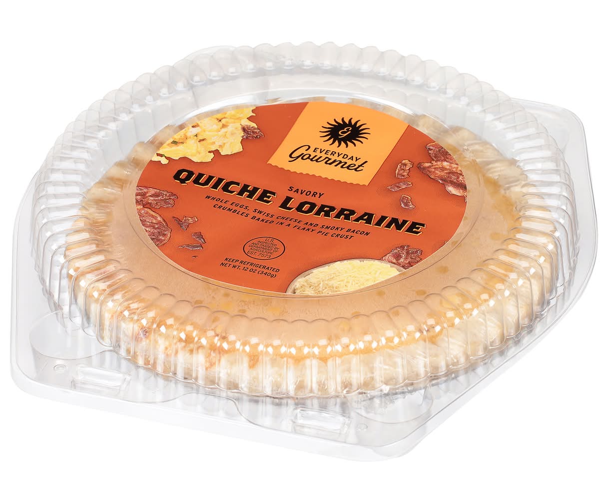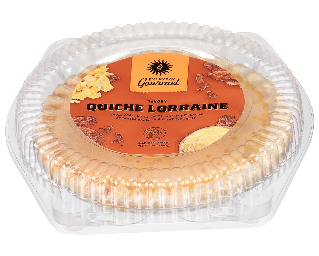 Ingredients: Pie Shell (Wheat Flour, [Unenriched, Unbleached], Vegetable Shortening [Interesterified Soybean Oil], Water, Salt, Dextrose, Baking Soda), Eggs, Mayonnaise (Soybean Oil, Distilled Vinegar, Water, Egg Yolk, Whole Egg, Contains Less than 2% of Salt, Sugar, Lemon Juice Concentrate, Natural Flavor, Oleoresin Paprika (for Color), Calcium Disodium EDTA [to Protect Flavor]), Water, Swiss Cheese (Cultured Pasteurized Part-Skim Milk, Salt, Enzymes, Anti-Caking Blend [Potato Starch, Powdered Cellulose]), Bacon (Pork, Water, Salt, Sugar, Sodium Nitrite, Sodium Phosphate, Smoke Flavoring, Sodium Erythorbate, Sodium Ascorbate), Contains Less than 2% of Whole Milk Powder, Onions, Food Starch Modified, Hot Sauce (Aged Red Cayenne Peppers, Vinegar, Salt, Natural Flavor, Xanthan Gum, Garlic), Salt, Nisin Preparation, Natural Flavor Contains: Eggs, Milk, Soybeans, Wheat