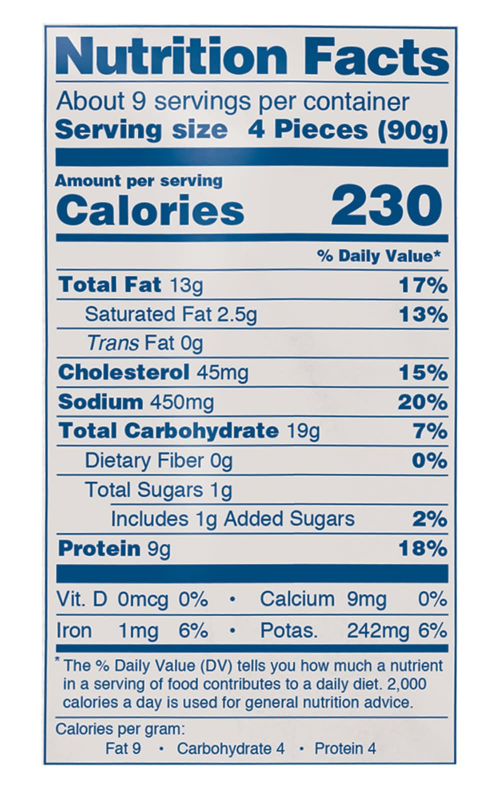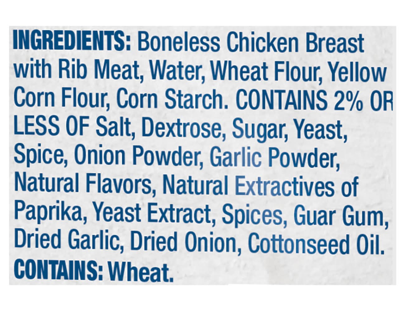 Ingredients: Boneless Chicken Breast with Rib Meat, Water, Wheat Flour, Yellow Corn Flour, Corn Starch, Contains 2% or Less of Salt, Dextrose, Sugar, Yeast, Spice, Onion Powder, Garlic Powder, Natural Flavors, Natural Extractives of Paprika, Yeast Extract, Spices, Guar Gum, Dried Garlic, Dried Onion, Cottonseed Oil Contains: Wheat