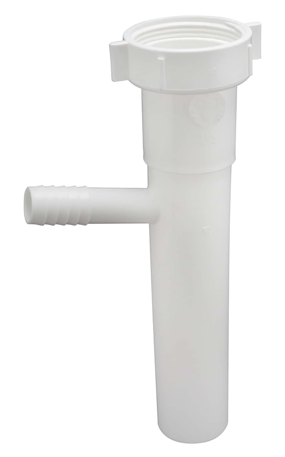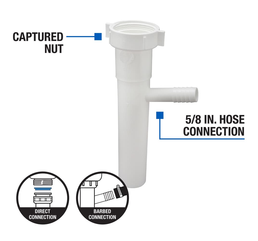 Plastic dishwasher branch tailpiece. 1-1/2-in inlet and 5/8-in OD branch. 12-in tailpiece length. Direct connection for fast and easy installation. Easy barbed connection to dishwasher discharge hose. Included captured nut is securely pre-attached and permanently fixed to prevent loss. Durable white PVC construction. Color: White