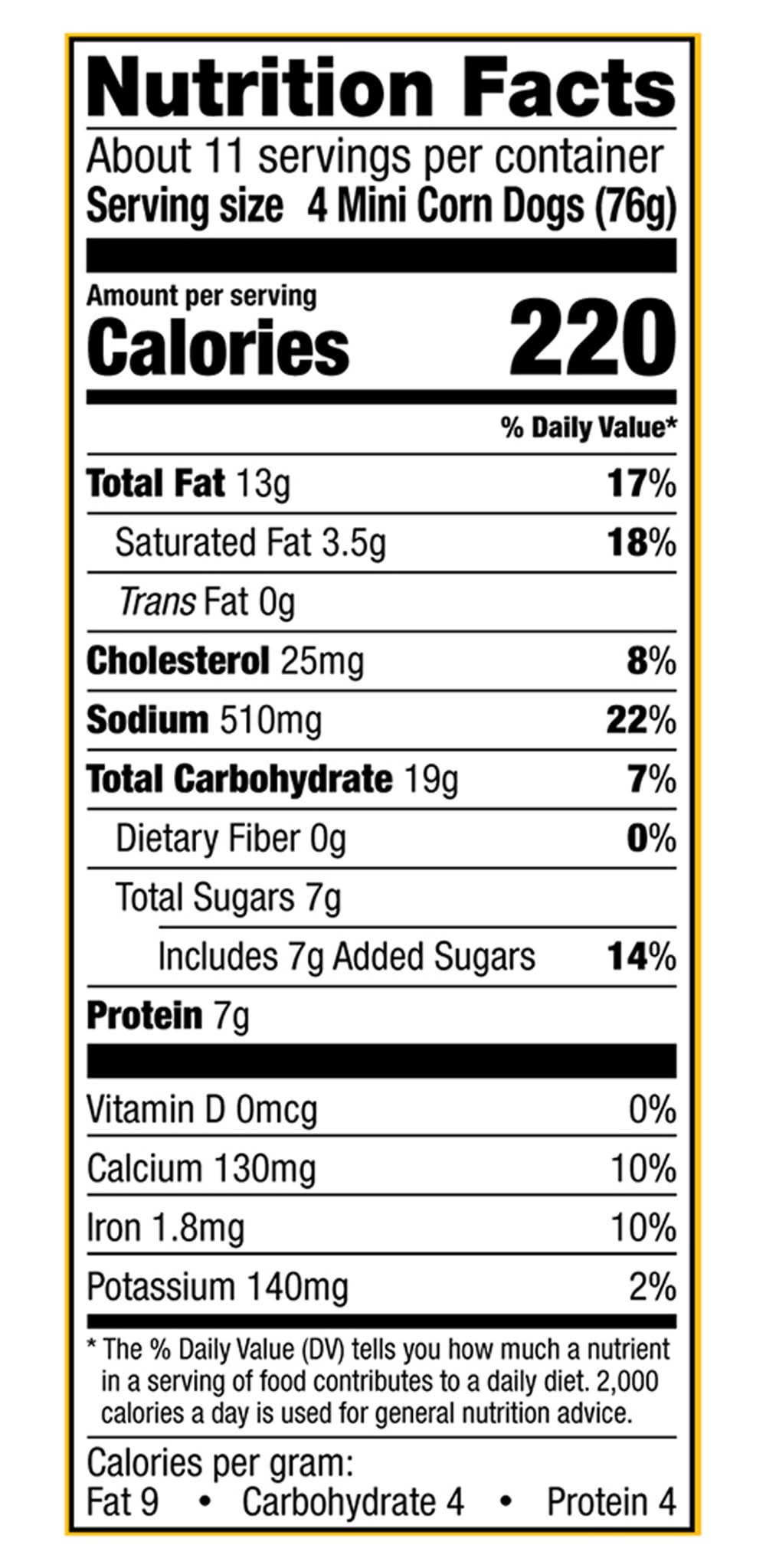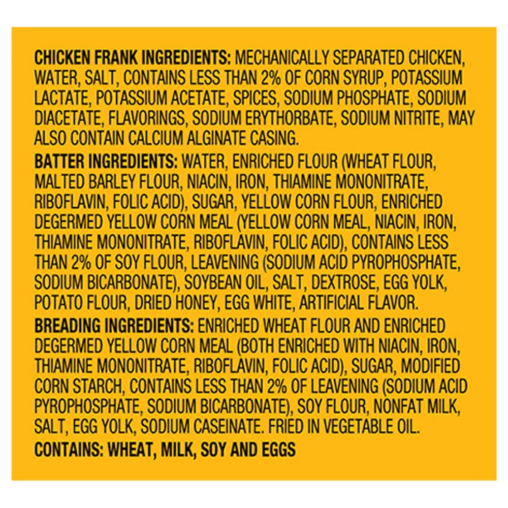 Ingredients: Chicken Frank Ingredients: Mechanically Separated Chicken, Water, Salt, Contains Less than 2% of Corn Syrup, Potassium Lactate, Potassium Acetate, Spices, Sodium Phosphate, Sodium Diacetate, Flavorings, Sodium Erythorbate, Sodium Nitrite, May Also Contain Calcium Alginate Casing, Batter Ingredients: Water, Enriched Flour (Wheat Flour, Malted Barley Flour, Niacin, Iron, Thiamine Mononitrate, Riboflavin, Folic Acid), Sugar, Yellow Corn Flour, Enriched Degermed Yellow Corn Meal (Yellow Corn Meal, Niacin, Iron, Thiamine Mononitrate, Riboflavin, Folic Acid), Contains Less than 2% of Soy Flour, Leavening (Sodium Acid Pyrophosphate, Sodium Bicarbonate), Soybean Oil, Salt, Dextrose, Egg Yolk, Potato Flour, Dried Honey, Egg White, Artificial Flavor, Breading Ingredients: Enriched Wheat Flour and Enriched Degermed Yellow Corn Meal (Both Enriched with Niacin, Iron, Thiamine Mononitrate, Riboflavin, Folic Acid), Sugar, Modified Corn Starch, Contains Less than 2% of Leavening (Sodium Acid Pyrophosphate, Sodium Bicarbonate), Soy Flour, Nonfat Milk, Salt, Egg Yolk, Sodium Caseinate, Fried in Vegetable Oil Contains: Wheat, Milk, Soybeans, Eggs, Corn, Barley