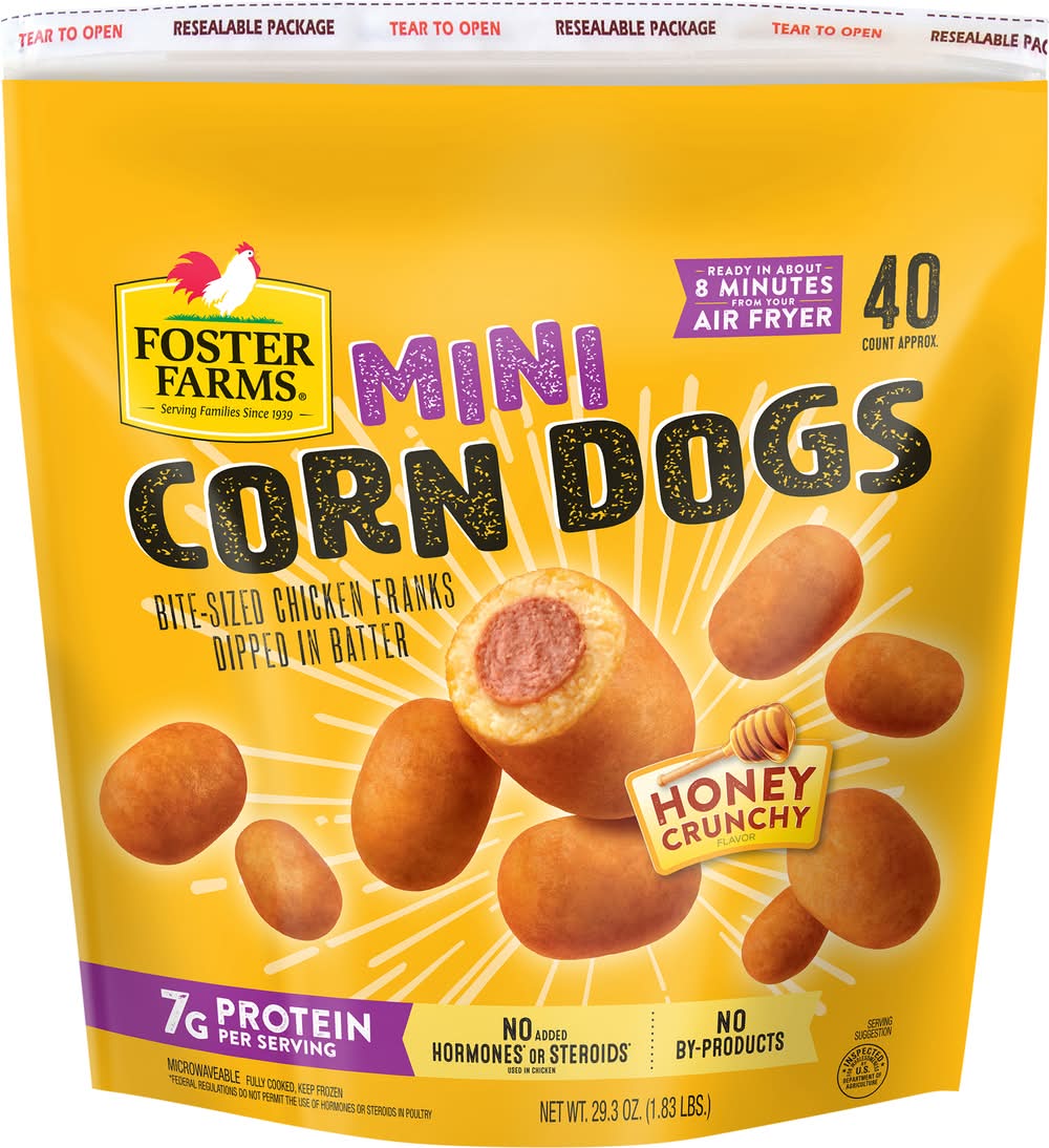 Bite-sized chicken franks dipped in batter. 7 g protein per serving. No added hormones or steroids used in chicken. Family owned since 1939. No added hormones No by-products. Fully cooked. Enjoy fun and yum, all in one. corn dogs have a mission: Share fun and yum with everyone! Made from plump, juicy hot dogs and double-dipped in our delicious batter, our Corn Dogs are made from chicken raised with no added hormones. You can feel good that it's the right choice to satisfy even the hungriest appetites. Available in a variety of flavors and sizes that are sure to please the whole family. Try them all! Better care. Better quality. Better taste. • Flavor: Honey crunchy • Number of servings: 11 • Foster Farms, Livingston, CA, 95334, Ph: 800-255-7227