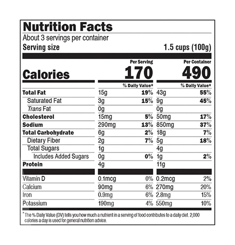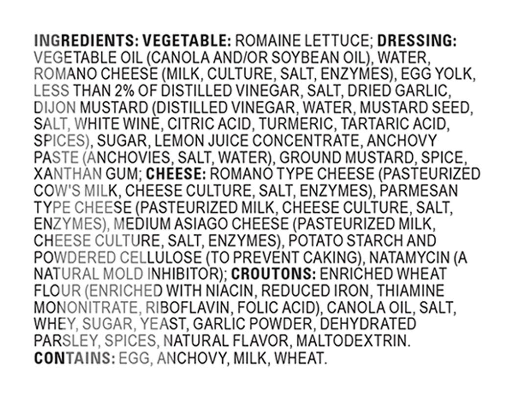 Ingredients: Vegetable: Romaine Lettuce; Dressing: Vegetable Oil (Canola and/or Soybean Oil), Water, Romano Cheese (Milk, Culture, Salt, Enzymes), Egg Yolk, Less than 2% of Distilled Vinegar, Salt, Dried Garlic, Dijon Mustard (Distilled Vinegar, Water, Mustard Seed, Salt, White Wine, Citric Acid, Turmeric, Tartaric Acid, Spices), Sugar, Lemon Juice Concentrate, Anchovy Paste (Anchovies, Salt, Water), Ground Mustard, Spice, Xanthan Gum; Cheese: Romano Type Cheese (Pasteurized Cow's Milk, Cheese Culture, Salt, Enzymes), Parmesan Type Cheese (Pasteurized Milk, Cheese Culture, Salt, Enzymes), Medium Asiago Cheese (Pasteurized Milk, Cheese Culture, Salt, Enzymes), Potato Starch and Powdered Cellulose (to Prevent Caking), Natamycin (a Natural Mold Inhibitor); Croutons: Enriched Wheat Flour (Enriched with Niacin, Reduced Iron, Thiamine Mononitrate, Riboflavin, Folic Acid), Canola Oil, Salt, Whey, Sugar, Yeast, Garlic Powder, Dehydrated Parsley, Spices, Natural Flavor, Maltodextrin Contains: Eggs, Fish, Anchovy, Milk, Wheat, Soybeans, Mustard