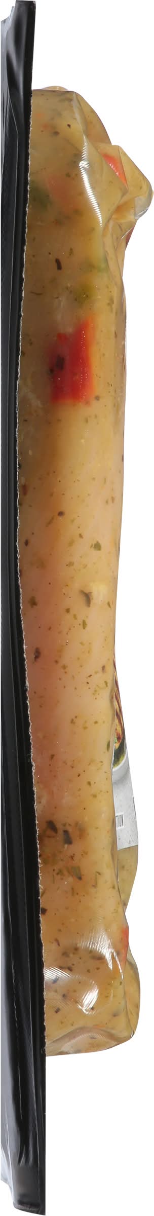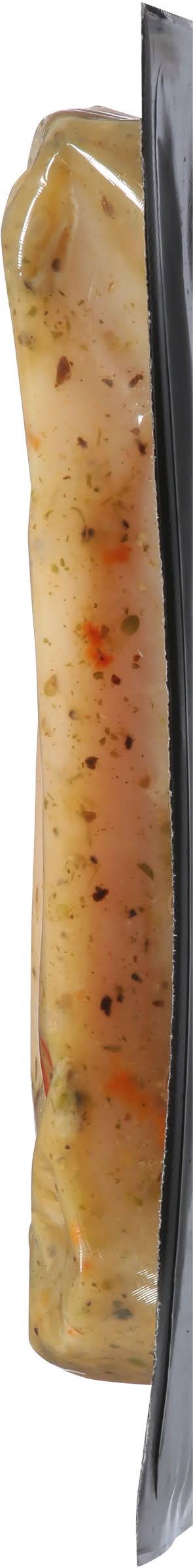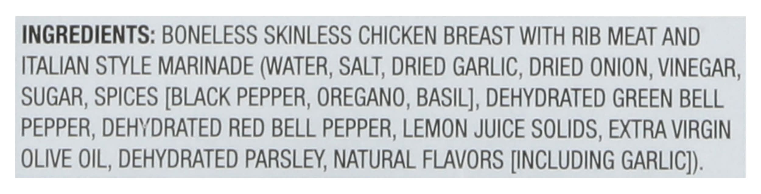 Ingredients: Boneless Skinless Chicken Breast with Rib Meat and Italian Style Marinade (Water, Salt, Dried Garlic, Dried Onion, Vinegar, Sugar, Spices [Black Pepper, Oregano, Basil], Dehydrated Green Bell Pepper, Dehydrated Red Bell Pepper, Lemon Juice Solids, Extra Virgin Olive Oil, Dehydrated Parsley, Natural Flavors [Including Garlic])