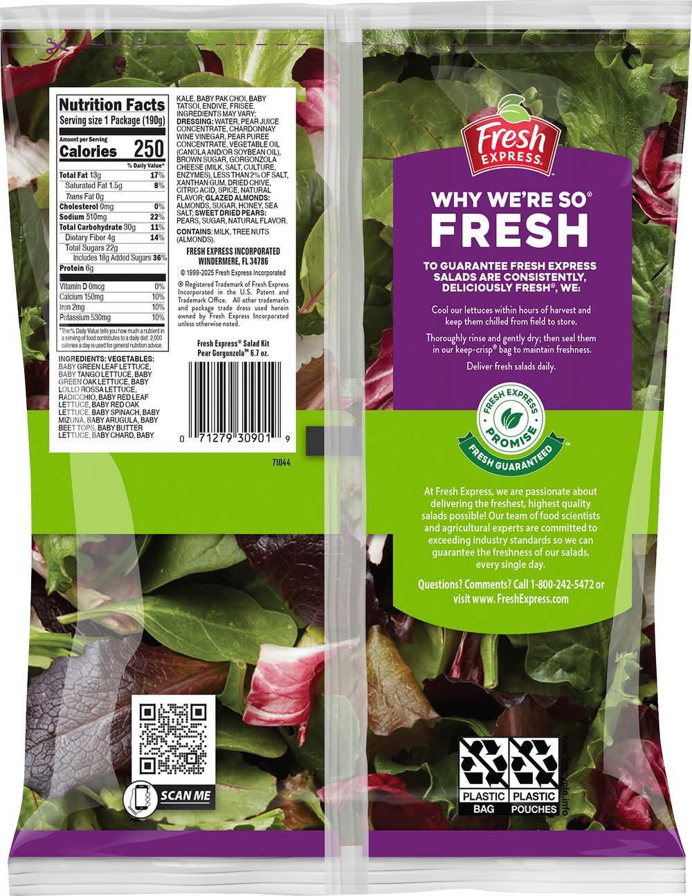 Ingredients: Vegetables: Baby Green Leaf Lettuce, Baby Tango Lettuce, Baby Green Oak Lettuce, Baby Lollo Rossa Lettuce, Radicchio, Baby Red Leaf Lettuce, Baby Red Oak Lettuce, Baby Spinach, Baby Mizuna, Baby Arugula, Baby Beet Tops, Baby Butter Lettuce, Baby Chard, Babykale, Baby Pak Choi, Baby Tatsoi, Endive, Frisee, Ingredients May Vary; Dressing: Water, Pear Juice Concentrate, Chardonnay Wine Vinegar, Pear Puree Concentrate, Vegetable Oil (Canola and/or Soybean Oil), Brown Sugar, Gorgonzola Cheese (Milk, Salt, Culture, Enzymes), Less than 2% of Salt, Xanthan Gum, Dried Chive, Citric Acid, Spice, Natural Flavor; Glazed Almonds: Almonds, Sugar, Honey, Sea Salt; Sweet Dried Pears: Pears, Sugar, Natural Flavor Contains: Milk, Tree Nuts, Almonds, Soybeans