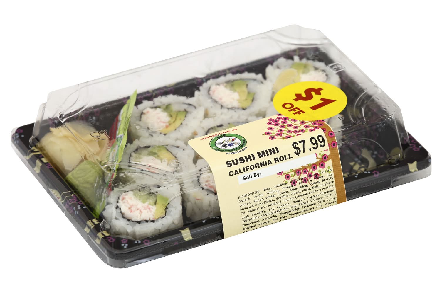 Ingredients: Rice, Imitation Crab (Fish Protein (Alaska Pollock, Pacific Whiting, Threadfin Bream), Water, Egg Whites, Sugar, Wheat Starch, Mirin Wine, Potato Starch, Modified Corn Starch, Sorbitol, Wheat Flour, Salt, Soybean Oil, Natural and Artificial Flavors (Hydrolyzed Soy Protein, Crab Extract), Soy Lecithin, Sodium Tripolyphosphate, Tetrasodium Pyrophosphate, Color Added, Carmine Color), Cucumber, Avocado, Vinegar (High Fructose Corn Syrup, Distilled Vinegar and Rice Vinegar (Diluted with Water), Salt and Brown Sugar), Wasabi (Horseradish, Corn Flour, Mustard, Ascorbic Acid (Vitamin C), Artificial Flavor, Artificial Color (FD&C Yellow 5, FD&C Blue 1)), Pickled Ginger (Ginger, Water, Vinegar, Salt, Acetic Acid, Citric Acid, Corn Syrup, Sorbitol, Aspartame, Potassium Sorbate, FD&C Red 40), Seaweed, Sesame Seed Contains: Eggs, Fish, Wheat