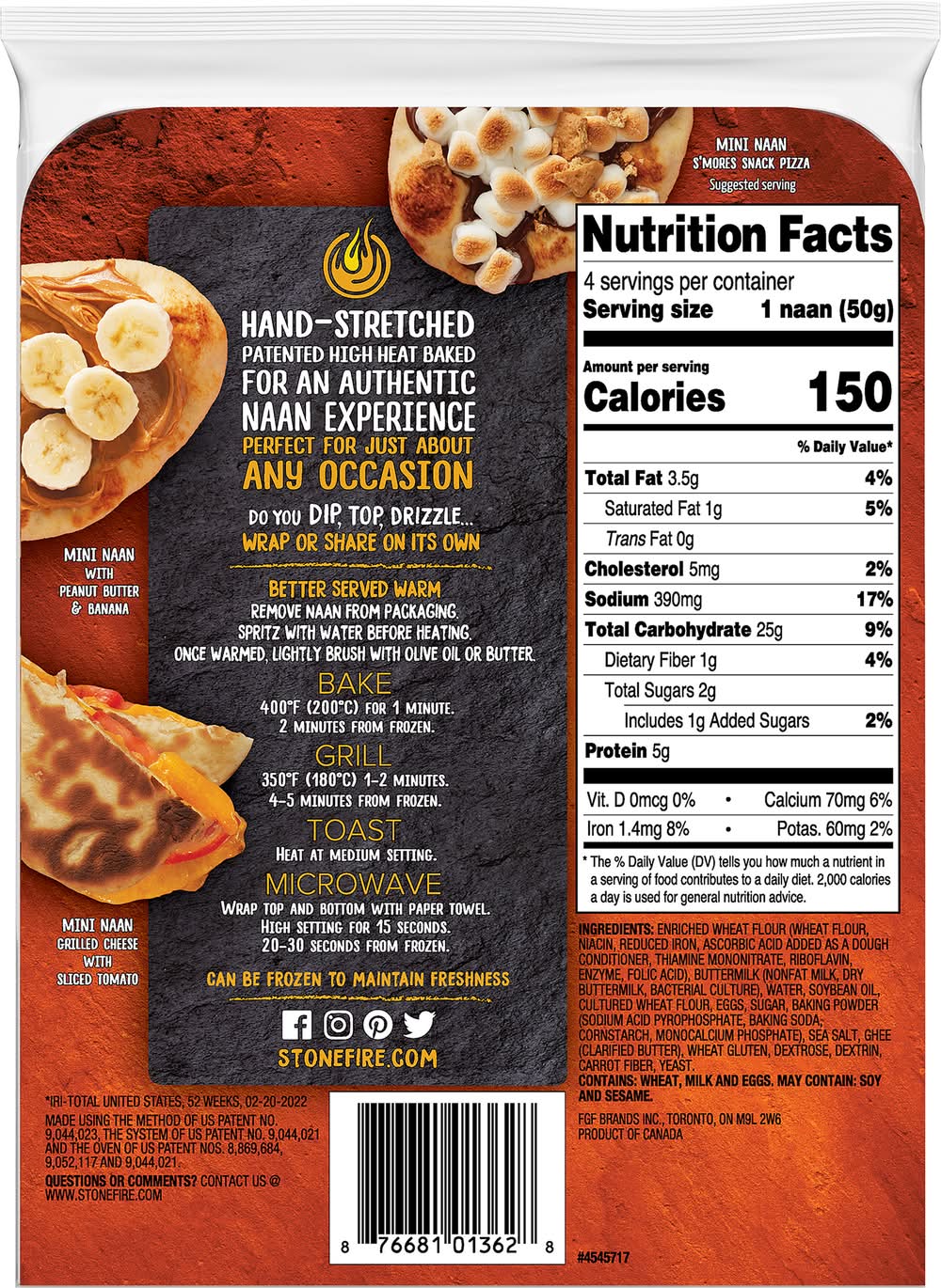 No artificial preservatives. Authentic flatbreads. America's no. 1 flatbread. Authentic taste. Hand-stretched patented high heat baked for an authentic naan experience perfect for just about any occasion. Do you dip, top, drizzle - wrap or share on its own. Mini naan with peanut butter & banana. Mini naan S'mores snack pizza. Mini naan grilled cheese with sliced tomato. www.stonefire.com. Facebook. Instagram. Pinterest. Twitter. Questions or comments? Contact us (at) www.stonefire.com. Product of Canada. Fgf, Toronto, ON M9L 2W6