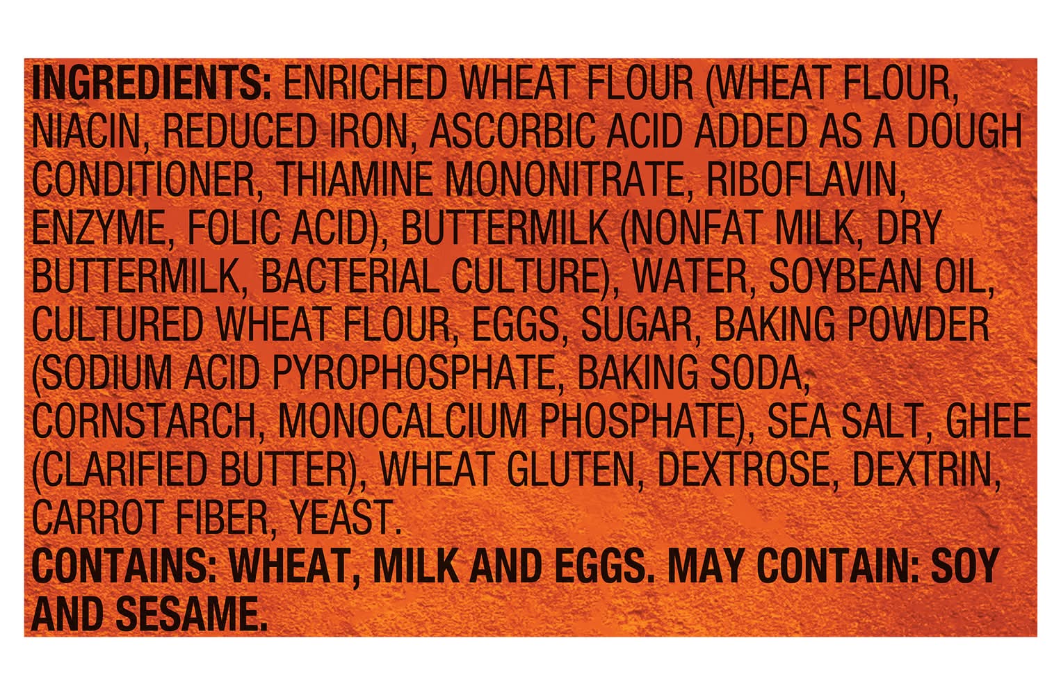 Ingredients: Enriched Wheat Flour (Wheat Flour, Niacin, Reduced Iron, Ascorbic Acid Added as Dough Conditioner, Thiamine Mononitrate, Riboflavin, Enzyme, Folic Acid), Buttermilk (Nonfat Milk, Dry Buttermilk, Bacterial Culture), Water, Soybean Oil, Cultured Wheat Flour, Eggs, Sugar, Baking Powder (Sodium Acid Pyrophosphate, Baking Soda, Cornstarch, Monocalcium Phosphate), Sea Salt, Ghee (Clarified Butter), Wheat Gluten, Dextrose, Dextrin, Carrot Fiber, Yeast Contains: Wheat, Milk, Eggs, Corn, Gluten, Soybeans, Soybeans, Sesame