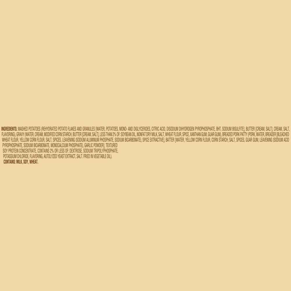 Ingredients: Mashed Potatoes Rehydrated Potato Flakes and Granules [Water, Potatoes, Mono- and Diglycerides, Citric Acid, Disodium Dihydrogen Pyrophosphate, BHT, Sodium Bisulfite], Butter [Cream, Salt], Cream, Salt, Flavoring, Gravy Water, Cream, Modified Corn Starch, Butter [Cream, Salt], Contains 2% or Less of: Soybean Oil, Nonfat Dry Milk, Salt, Wheat Flour, Spice, Xanthan Gum, Guar Gum, Breaded Pork Patty Pork, Water, Breader [Bleached Wheat Flour, Yellow Corn Flour, Salt, Spices, Leavening {Sodium Aluminum Phosphate, Sodium Bicarbonate}, Spice Extractive], Batter [Water, Yellow Corn Flour, Corn Starch, Salt, Spices, Guar Gum, Leavening {Sodium Acid Pyrophosphate, Sodium Bicarbonate, Monocalcium Phosphate}, Garlic Powder], Textured Soy Protein Concentrate, Dextrose, Sodium Tripolyphosphate, Flavoring, Potassium Chloride, Autolyzed Yeast Extract, Salt, Fried in Vegetable Oil. Contains: Milk, Soy, Wheat