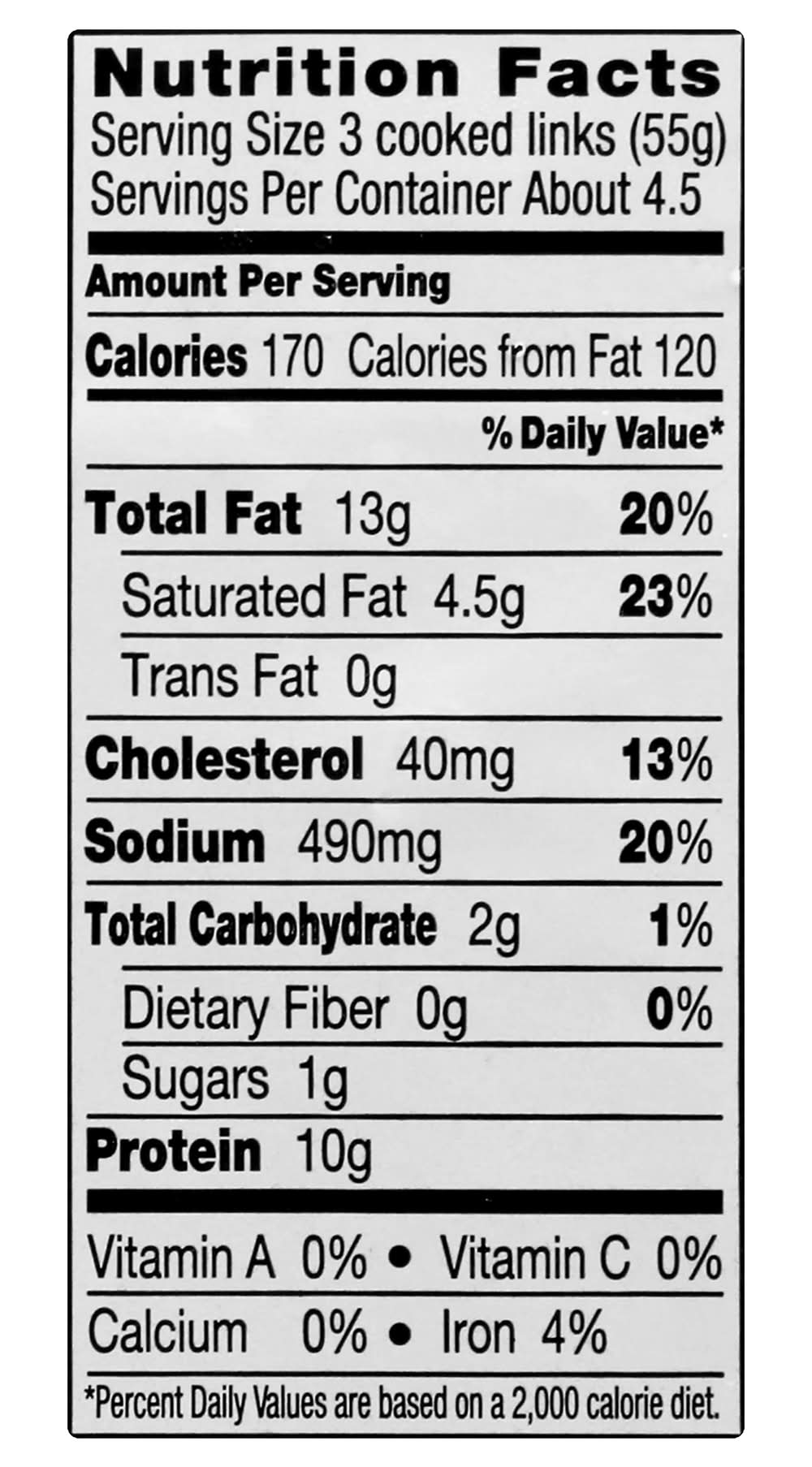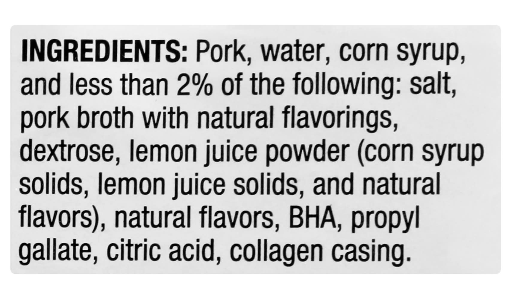 Ingredients: Pork, Water, Corn Syrup, and Less than 2% of the Following: Salt, Pork Broth with Natural Flavorings, Dextrose, Lemon Juice Powder (Corn Syrup Solids, Lemon Juice Solids, and Natural Flavors), Natural Flavors, BHA, Propyl Gallate, Citric Acid, Collagen Casing