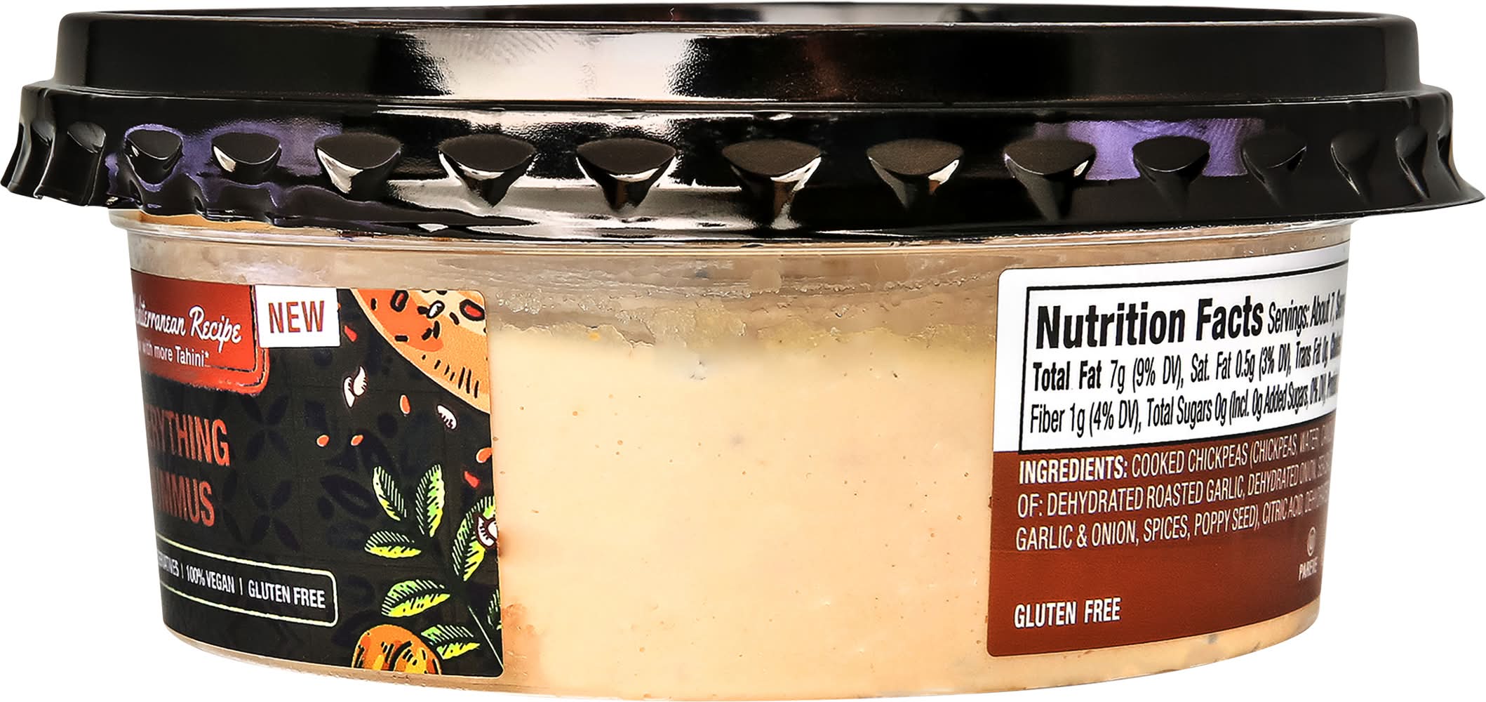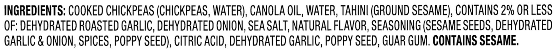 Ingredients: Cooked Chickpeas (Chickpeas, Water), Canola Oil, Water, Tahini (Ground Sesame), Contains 2% or Less of: Dehydrated Roasted Garlic, Dehydrated Onion, Sea Salt, Natural Flavor, Seasoning (Sesame Seeds, Dehydrated Garlic & Onion, Spices, Poppy Seed), Citric Acid, Dehydrated Garlic, Poppy Seed, Guar Gum Contains: Sesame