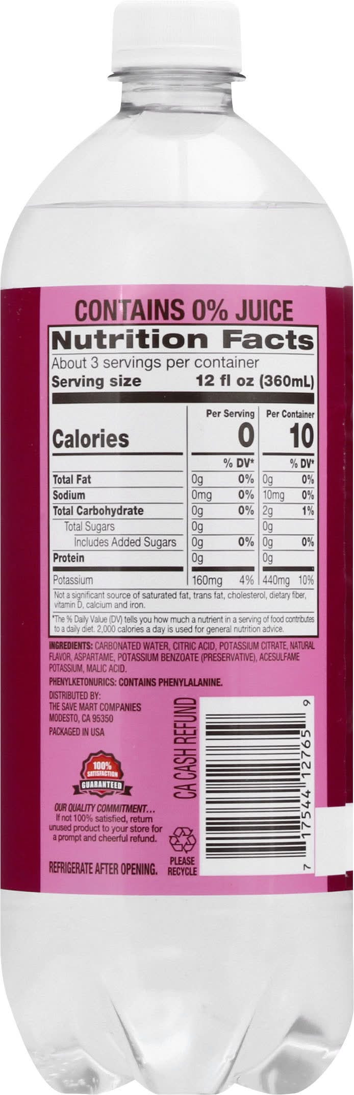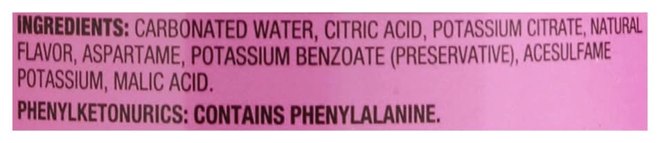 Ingredients: Carbonated Water, Citric Acid, Potassium Citrate, Natural Flavor, Aspartame, Potassium Benzoate (Preservative), Acesulfame Potassium, Malic Acid
