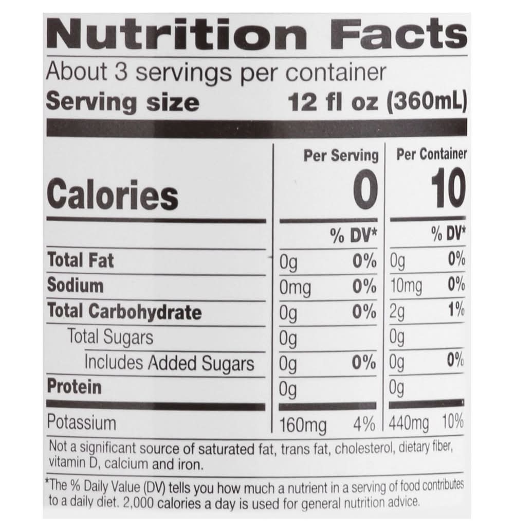 Flavored with other natural flavors. Per 12 fl oz: 0 calories; 0 g sat fat (0% DV); 0 mg sodium (0% DV); 0 g total sugars. Sugar free. Caffeine free. Calorie free per serving. 100% satisfaction guarantee. Our quality commitment. If not 100% satisfied, return unused product to your store for a prompt and cheerful refund. Please recycle. Packaged in USA. Packaging: Reusable