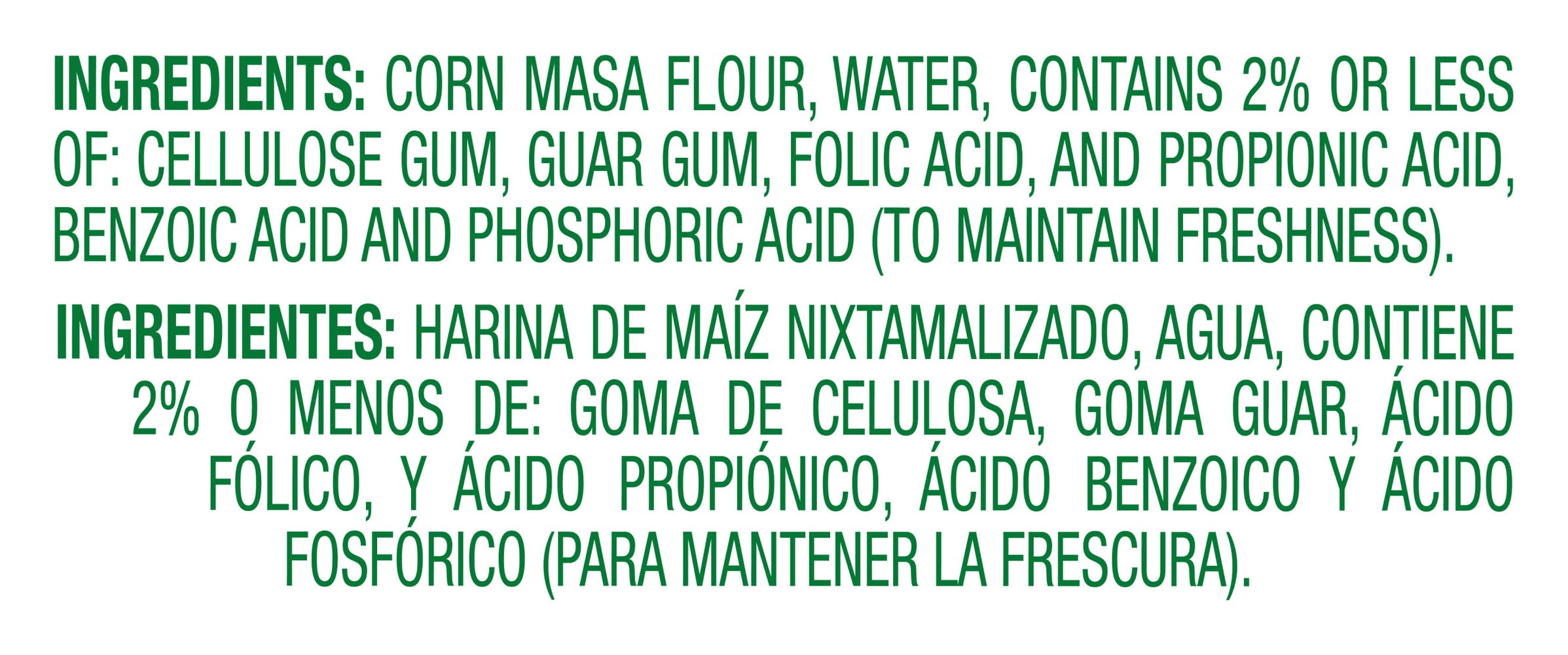 Ingredients: Corn Masa Flour, Water, Contains 2% Or Less Of: Cellulose Gum, Guar Gum, Folic Acid, And Propionic Acid, Benzoic Acid And Phosphoric Acid (To Maintain Freshness). Contains: Contains wheat.