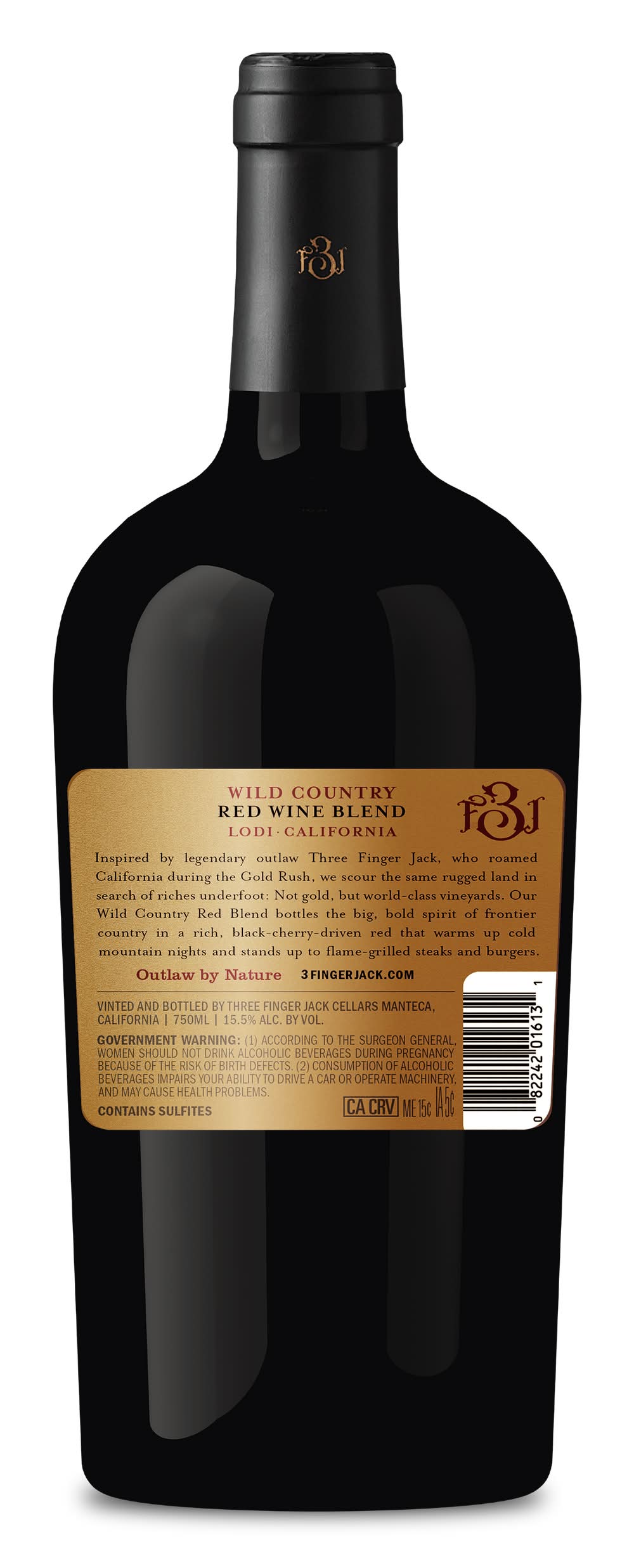 Roaming the Sierra Foothills of California Gold Country, situated 75 miles east of San Francisco, a notorious desperado by the name of Three Finger Jack searched the rugged wilderness relentlessly for riches. Nobody knows how he lost his fingers, or how he died, but his legend lives on today in the Lodi region of California, through our wine. The gold may be gone but the wine, grown in the land where Jack once roved, pays tribute to Jack's outlaw nature. The Wild Country Red Wine, set in its craft-spirits inspired bottle, is the perfect ode to a legendary outlaw and stands up to its name. Three Finger Jack - Outlaw by Nature. Alcohol by volume: 14.5%