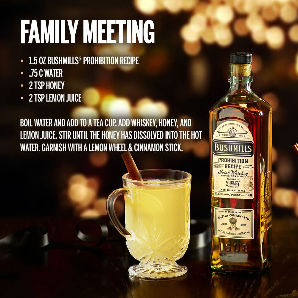 Bushmills Peaky Blinders Prohibition Recipe Whiskey was carefully overseen by Master Distiller Colum Egan to create something special: a whiskey that is true to the era – a taste of Prohibition - but also overachieves in complexity and intensity, a true testament to the Peaky Blinders way of life. You too can drink like Tommy Shelby. Bushmills Prohibition Recipe Irish Whiskey, by order of the Shelby Company Limited. Alcohol by volume: 46%