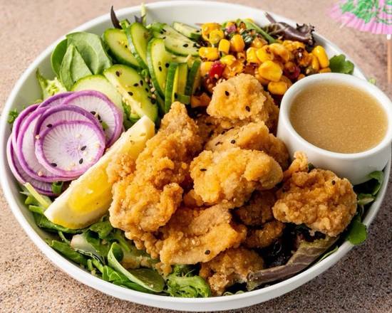 Crispy ginger garlic fried chicken, a base of mixed greens, your choice of three sides, green onions, sesame seeds, and a lemon wedge. Served with a dressing of your choice and our signature mac salad (for just $1). (Gluten-free)