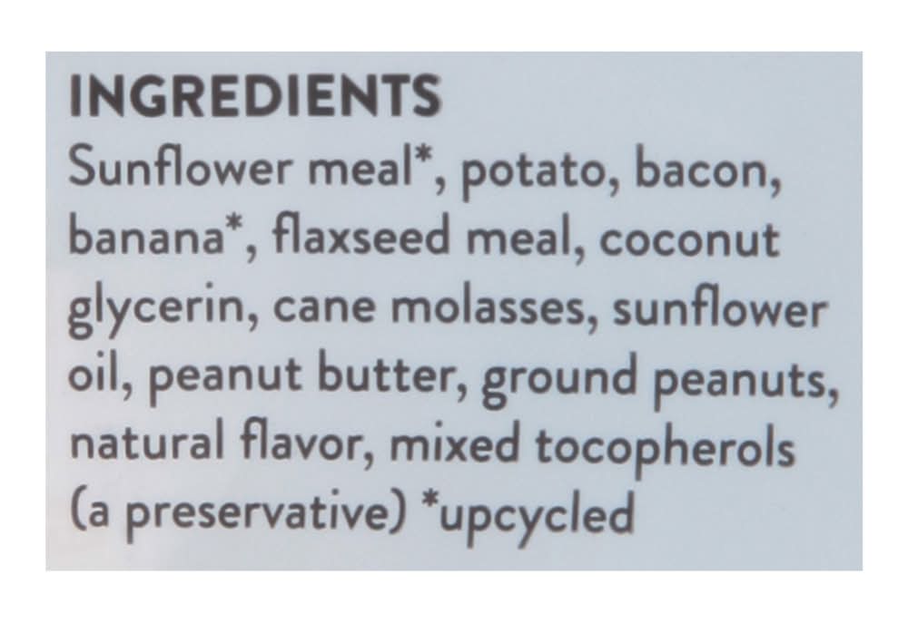 Ingredients: Sunflower Meal (Upcycled), Potato, Bacon, Banana (Upcycled), Flaxseed Meal, Coconut Glycerin, Glucose Syrup, Sunflower Oil, Peanut Butter, Ground Peanuts, Mixed Tocopherols (a Preservative) Contains: Tree Nuts, Coconuts, Peanuts
