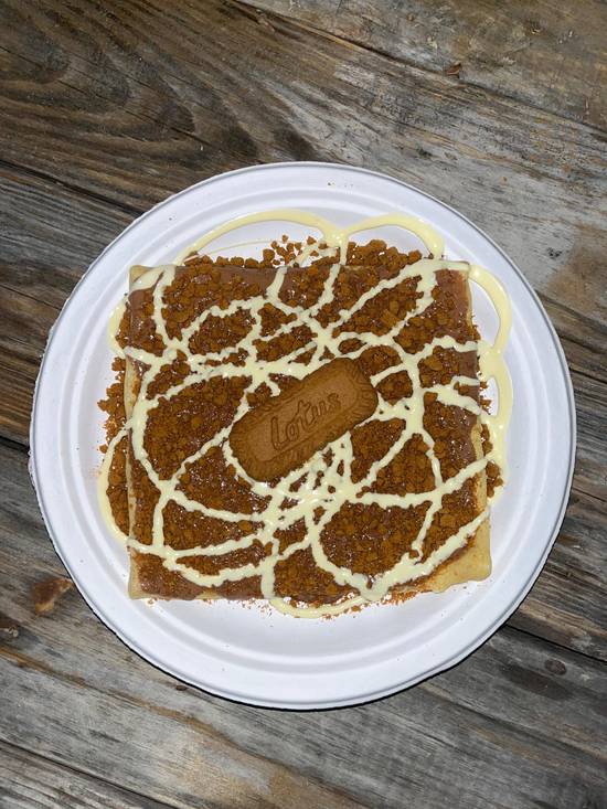 Enjoy a delicate crepe filled with smooth Belgian chocolate, topped with a sprinkle of crushed Lotus Biscoff for a delightful crunch, creating a sweet, indulgent treat that melts in your mouth.