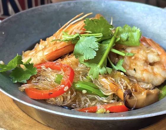 Glass noodles with Thai-Style sukiyaki sauce, egg and morning glory.