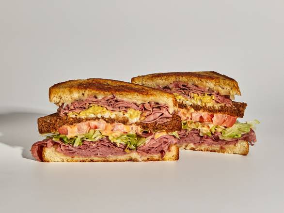 Pastrami, corned beef, swiss cheese, lettuce, tomato, coleslaw, thousand island, spicy mustard. Stacked between rye, pumpernickel and sourdough.
