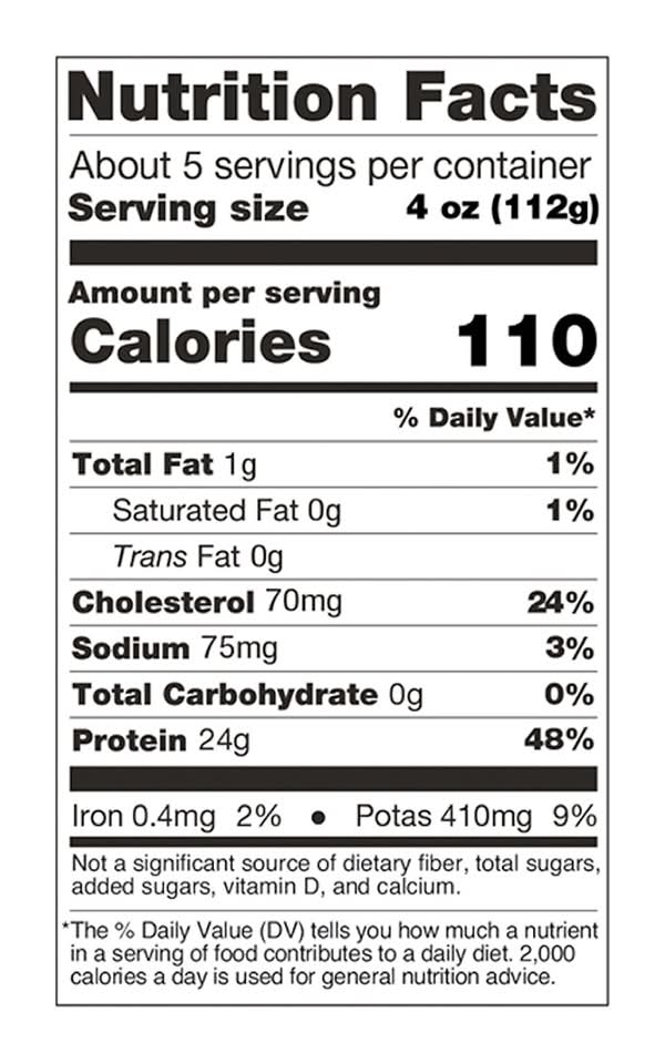 24g protein per serving. Gluten free. No antibiotics ever. Humanely raised on family farms Family farm or ranch is any farm or ranch organized as a sole proprietorship, partnership, or family corporation where the majority of the business is owned and controlled by the person and his or her relatives. Fed Optimal diet of vegetables & grains. Up to 4% retained water. No added hormones or steroids Federal regulations prohibit the use of hormones or steroids in poultry. Excellent protein source. Packaging: Reusable