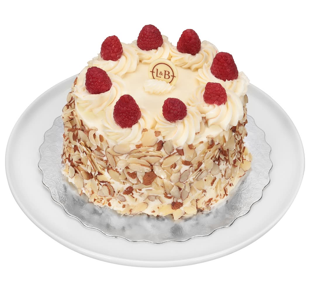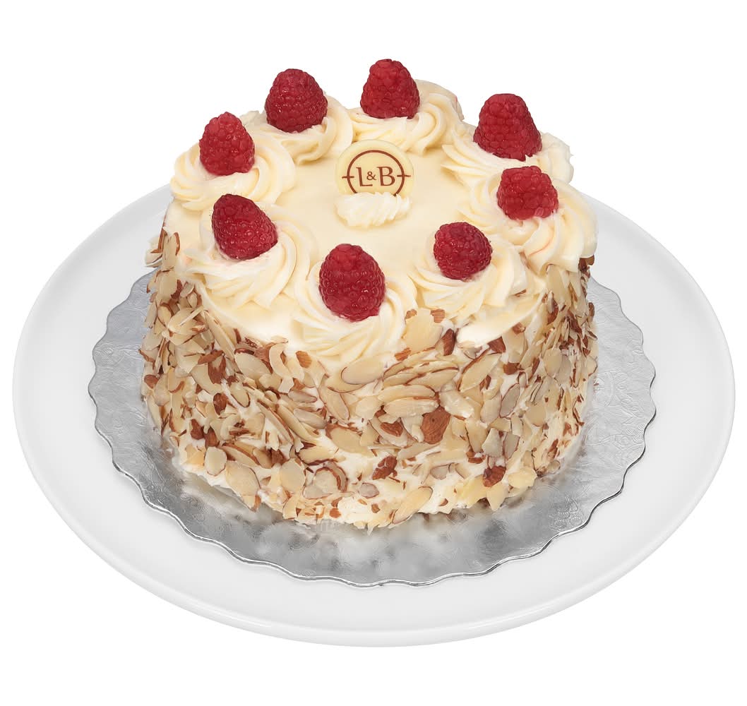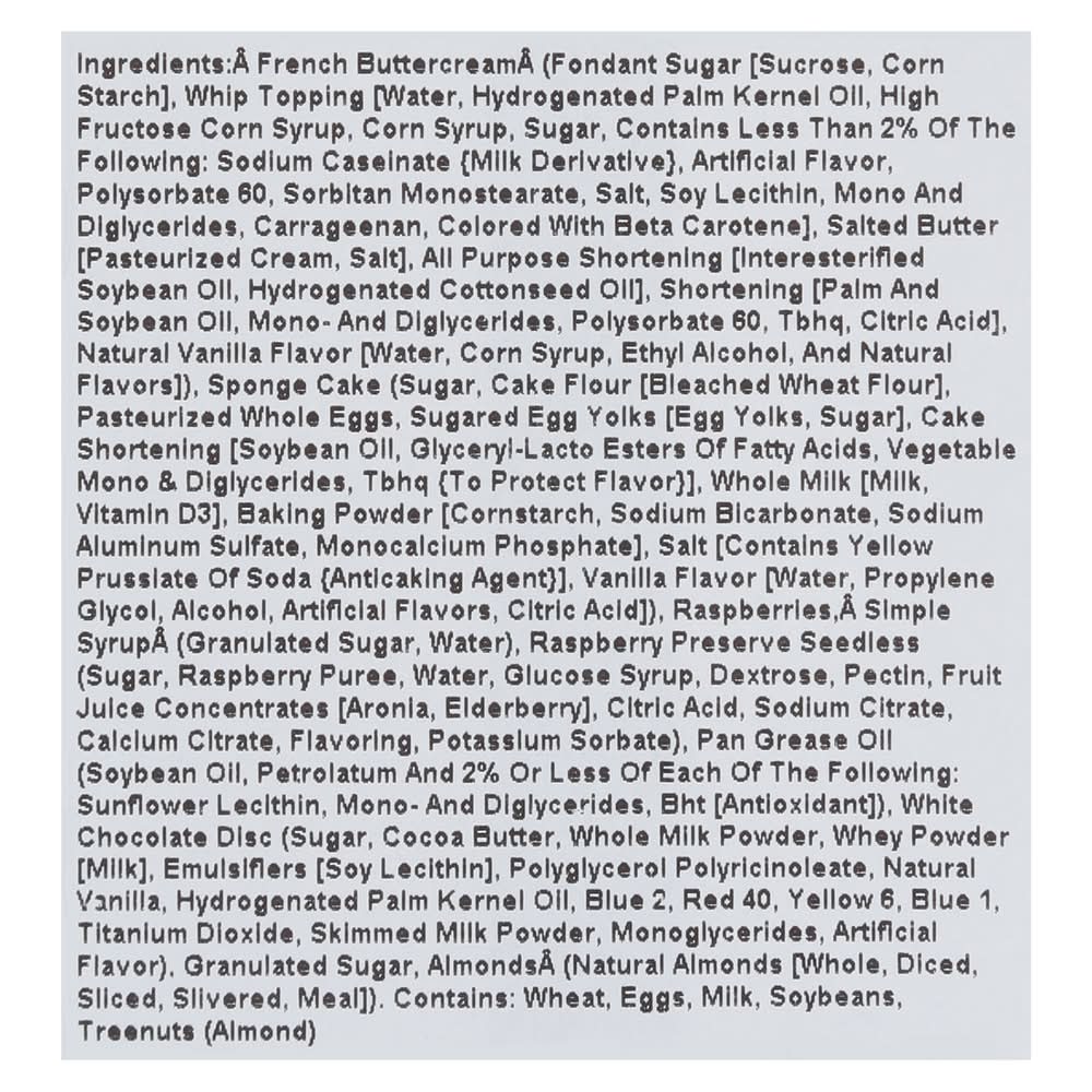 Ingredients: French Buttercream (Fondant Sugar [Sucrose Corn Starch] Whip Topping [Water Hydrogenated Palm Kernel Oil High Fructose Corn Syrup Corn Syrup Sugar Contains Less than 2% of the Following: Sodium Caseinate (Milk Derivative), Artificial Flavor, Polysorbate 60, Sorbitan Monostearate, Salt, Soy Lecithin, Mono and Diglycerides, Carrageenan, Colored with Beta Carotene], Salted Butter [Pasteurized Cream, Salt], All Purpose Shortening [Interesterified Soybean Oil, Hydrogenated Cottonseed Oil], Shortening [Palm and Soybean Oil, Mono- and Diglycerides, Polysorbate 60, TBHQ, Citric Acid], Natural Vanilla Flavor [Water, Corn Syrup, Ethyl Alcohol, and Natural Flavors]), Sponge Cake (Sugar Cake Flour [Bleached Wheat Flour] Pasteurized Whole Eggs Sugared Egg Yolks [Egg Yolks Sugar] Cake Shortening [Soybean Oil Glyceryl-Lacto Esters of Fatty Acids Vegetable Mono & Diglycerides TBHQ (to Protect Flavor)], Whole Milk [Milk, Vitamin D3], Baking Powder [Cornstarch, Sodium Bicarbonate, Sodium Aluminum Sulfate, Monocalcium Phosphate], Salt [Contains Yellow Prussiate of Soda (Anticaking Agent)], Vanilla Flavor [Water, Propylene Glycol, Alcohol, Artificial Flavors, Citric Acid]), Raspberries, Simple Syrup (Granulated Sugar Water), Raspberry Preserve Seedless (Sugar Raspberry Puree Water Glucose Syrup Dextrose Pectin Fruit Juice Concentrate [Aronia Elderberry] Citric Acid Sodium Citrate Calcium Citrate Flavoring Potassium Sorbate), Pan Grease Oil (Soybean Oil Petrolatum and 2% or Less of Each of the Following: Sunflower Lecithin Mon- and Diglycerides Bhq (Antioxidant)], White Chocolate Disc (Sugar Cocoa Butter Whole Milk Powder Whey Powder [Milk] Emulsifiers [Soy Lecithin] Polyglycerol Polyricinoleate Natural Vanilla Hydrogenated Palm Kernel Oil Blue 2 Red 40 Yellow 6 Blue 1 Titanium Dioxide Skimmed Milk Powder Monoglycerides Artificial Flavor), Granulated Sugar, Almonds (Natural Almonds [Whole Diced Sliced Silvered Meal]) Contains: Wheat, Eggs, Milk, Soybeans, Corn