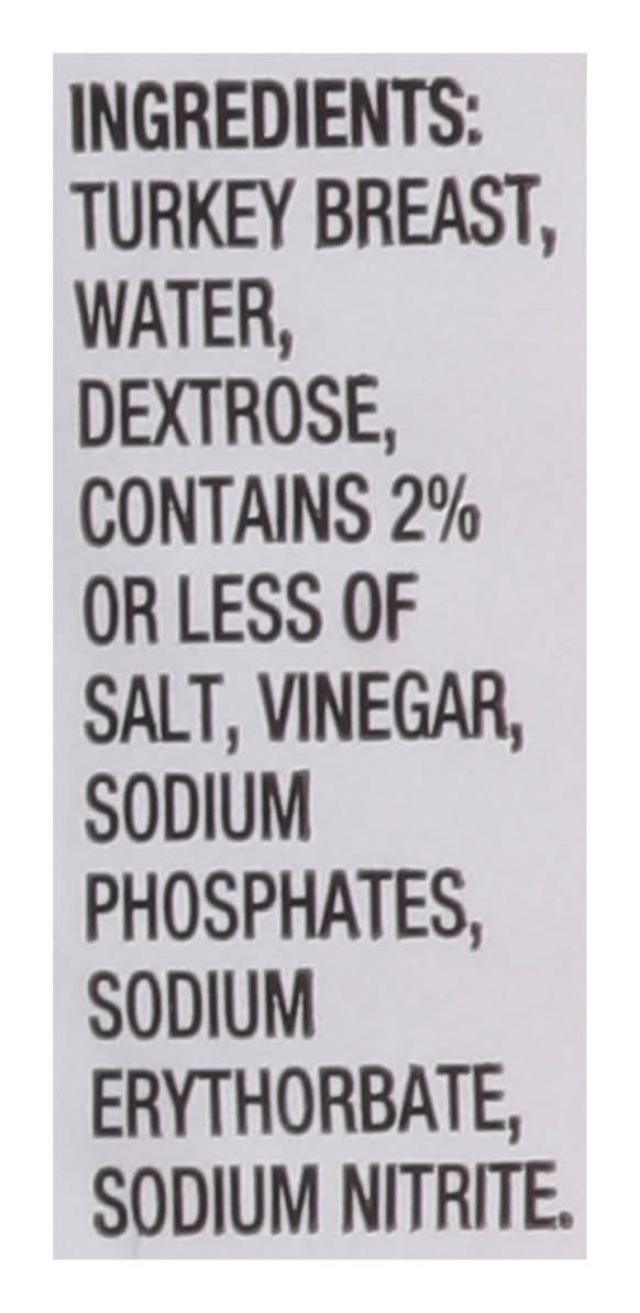 Ingredients: Turkey Breast, Water, Dextrose, Contains 2% or Less of Salt, Vinegar, Sodium Phosphates, Sodium Erythorbate, Sodium Nitrite