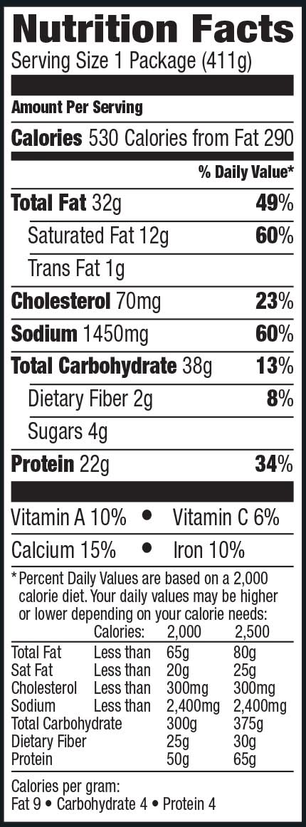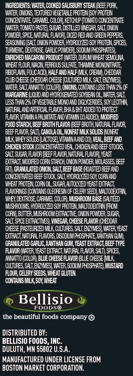 Ingredients: Cooked Salisbury Steak Beef, Pork, Textured Vegetable Protein [Soy Protein Concentrate, Caramel Color], Ketchup [Tomato Concentrate {Water, Tomato Paste}, Distilled Vinegar, Diced Red and Green Peppers, Seasoning [Salt, Hydrolyzed Soy Protein, Turmeric, Garlic Powder], Sodium Phosphates, Cooked Enriched Macaroni Product Water, Durum Wheat Semolina, Niacin, Iron [Ferrous Sulfate], Thiamine Mononitrate, Riboflavin, Folic Acid, Half and Half Milk, Cream, Whey Protein Concentrate, Skim Milk, Contains Less than 2% of Salt, Milkfat, Paprika Oleoresin and Annatto [Color], Modified Food Starch, Cheddar Club Cheese Cheddar Cheese [Cultured Milk, Annatto [Color], Canola Oil, Cheese Cultures, Powdered Cellulose [to Prevent Caking], Beef Broth Flavor Beef Broth, Flavor, Nonfat Milk Solids Nonfat Milk, Whey Solids [Lactose], Vitamin A and D3, Veal, Chicken and Beef Stocks, Flavor [Beef Flavor, Modified Corn Starch, Molasses, Beef Fat, Granulated Onion, Beef Base Roasted Beef and Concentrated Beef Stock, Hydrolyzed Soy, Corn and Wheat Protein, Corn Oil, Autolyzed Yeast Extract, Maltodextrin, Caramel Color, Cheese Flavor Cheddar Cheese [Pasteurized Milk, Cultures, Natural Flavors, Mushroom Base Sautéed Mushrooms, Hydrolyzed Soy Protein, Maltodextrin [from Corn], Butter, Mushroom Extractive, Spice Extractives, Rice Wine Vinegar Water, Rice, Granulated Garlic, Beef Type Flavor Water, Blue Cheese Powder Blue Cheese [Pasteurized Milk, Annatto Color, Mustard Flour, Celery Seeds., Water, Salt, Yeast Extract, Onion Powder, Sugar, Spice, Onion, Xantha Gum, Enzymes, Sodium Phosphate., Disodium Phosphate., Natural Flavor, Dextrose, Whey Contains: Milk, Soy, Wheat