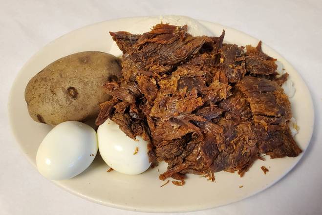 Shredded and seasoned beef jerky served with white corn, boiled potato, egg, and cheese. (Carne de res seca con maiz, papa, huevo duro y quesillo.).