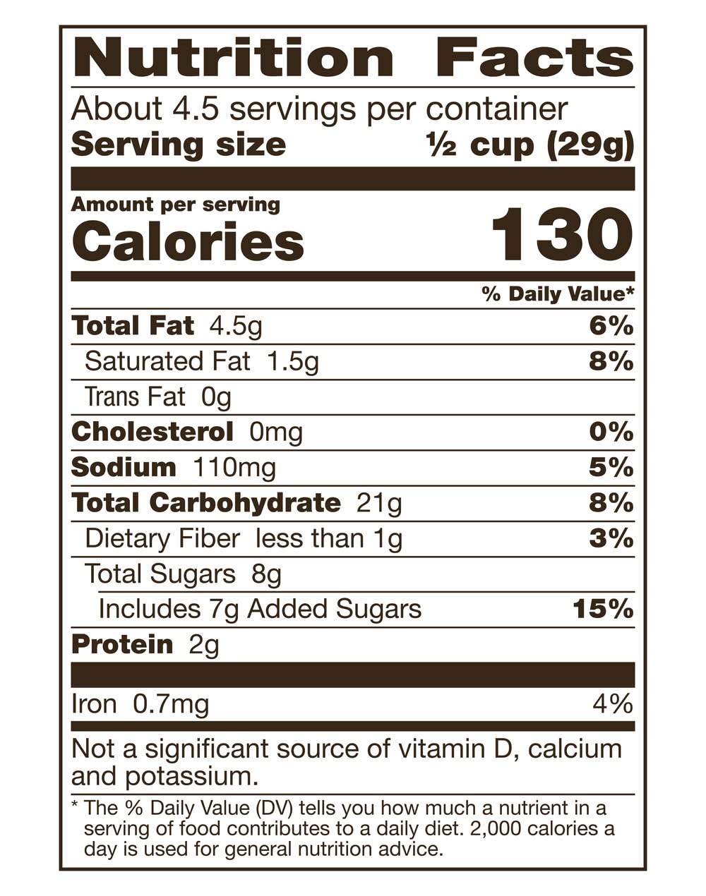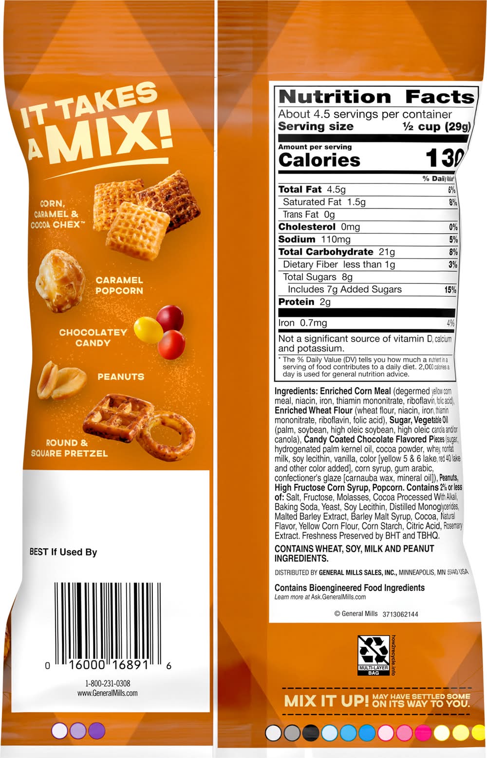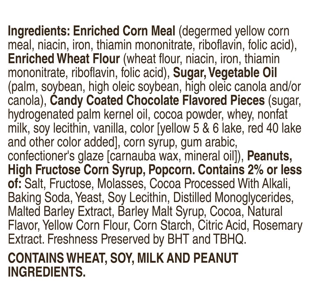 Ingredients: Enriched Corn Meal (Degermed Yellow Corn Meal, Niacin, Iron, Thiamin Mononitrate, Riboflavin, Folic Acid), Enriched Wheat Flour (Wheat Flour, Niacin, Iron, Thiamin Mononitrate, Riboflavin, Folic Acid), Sugar, Vegetable Oil (Palm, Soybean, High Oleic Soybean, High Oleic Canola and/or Canola), Candy Coated Chocolate Flavored Pieces (Sugar, Hydrogenated Palm Kernel Oil, Cocoa Powder, Whey, Nonfat Milk, Soy Lecithin, Vanilla, Color [Yellow 5 & 6 Lake, Red 40 Lake and Other Color Added], Corn Syrup, Gum Arabic, Confectioner's Glaze [Carnauba Wax, Mineral Oil]), Peanuts, High Fructose Corn Syrup, Popcorn. Contains 2% or Less of: Salt, Fructose, Molasses, Cocoa Processed with Alkali, Baking Soda, Yeast, Soy Lecithin, Distilled Monoglycerides, Malted Barley Extract, Barley Malt Syrup, Cocoa, Natural Flavor, Yellow Corn Flour, Corn Starch, Citric Acid, Rosemary Extract, Freshness Preserved by BHT and TBHQ Contains: Wheat, Soybeans, Milk, Peanuts, Barley