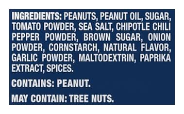 Ingredients: Peanuts, Peanut Oil, Sugar, Tomato Powder, Sea Salt, Chipotle Chili Pepper Powder, Brown Sugar, Onion Powder, Cornstarch, Natural Flavor, Garlic Powder, Maltodextrin, Paprika Extract, Spices Contains: Peanuts, Tree Nuts